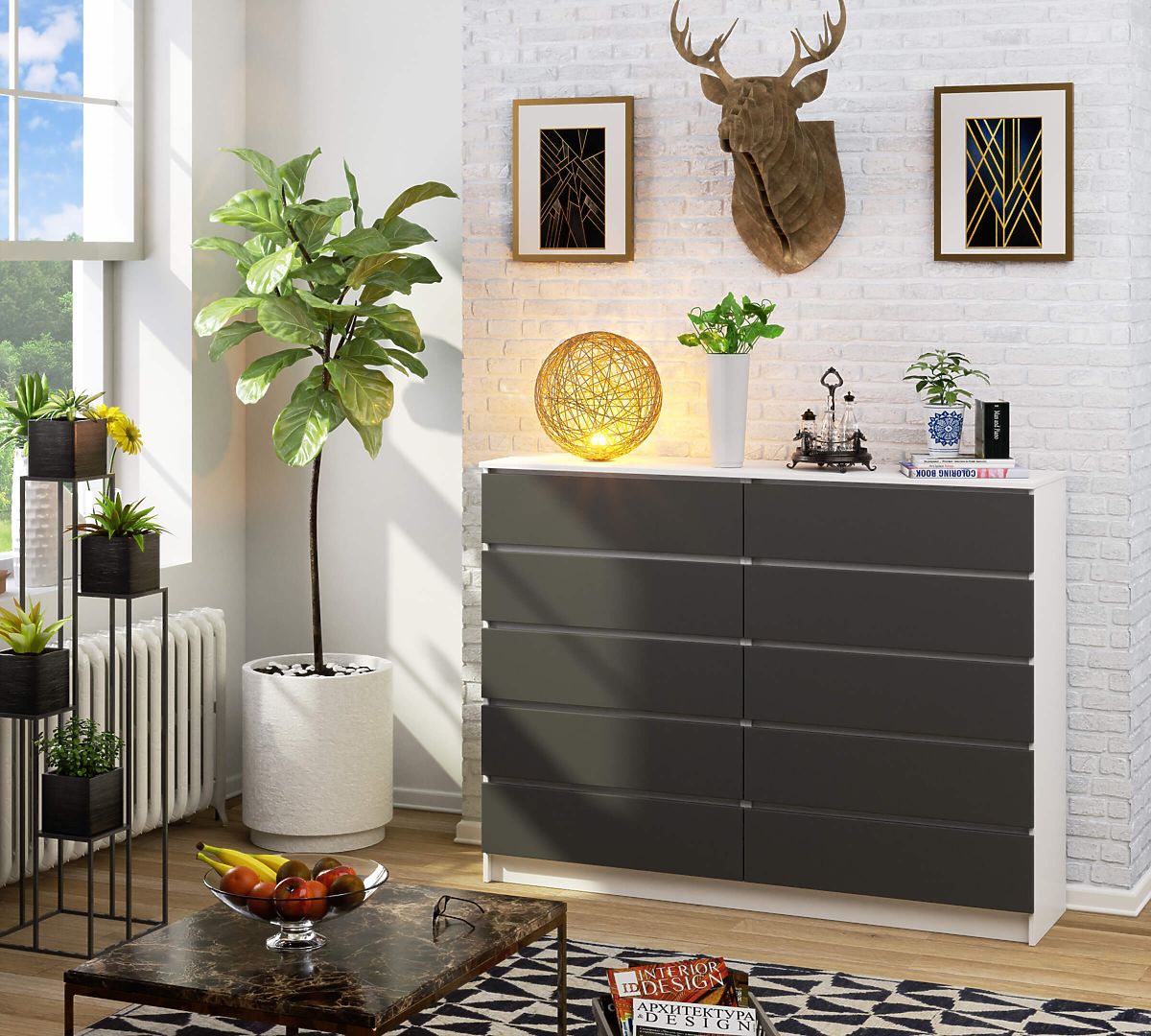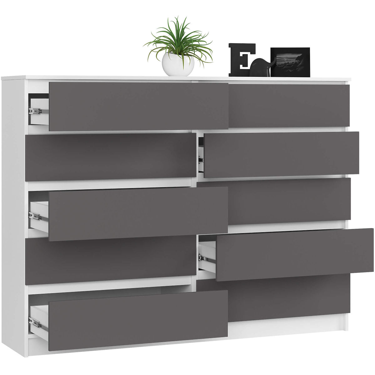 Komoda z 10 szufladami z białym korpusem i szarymi frontami. .. więcej