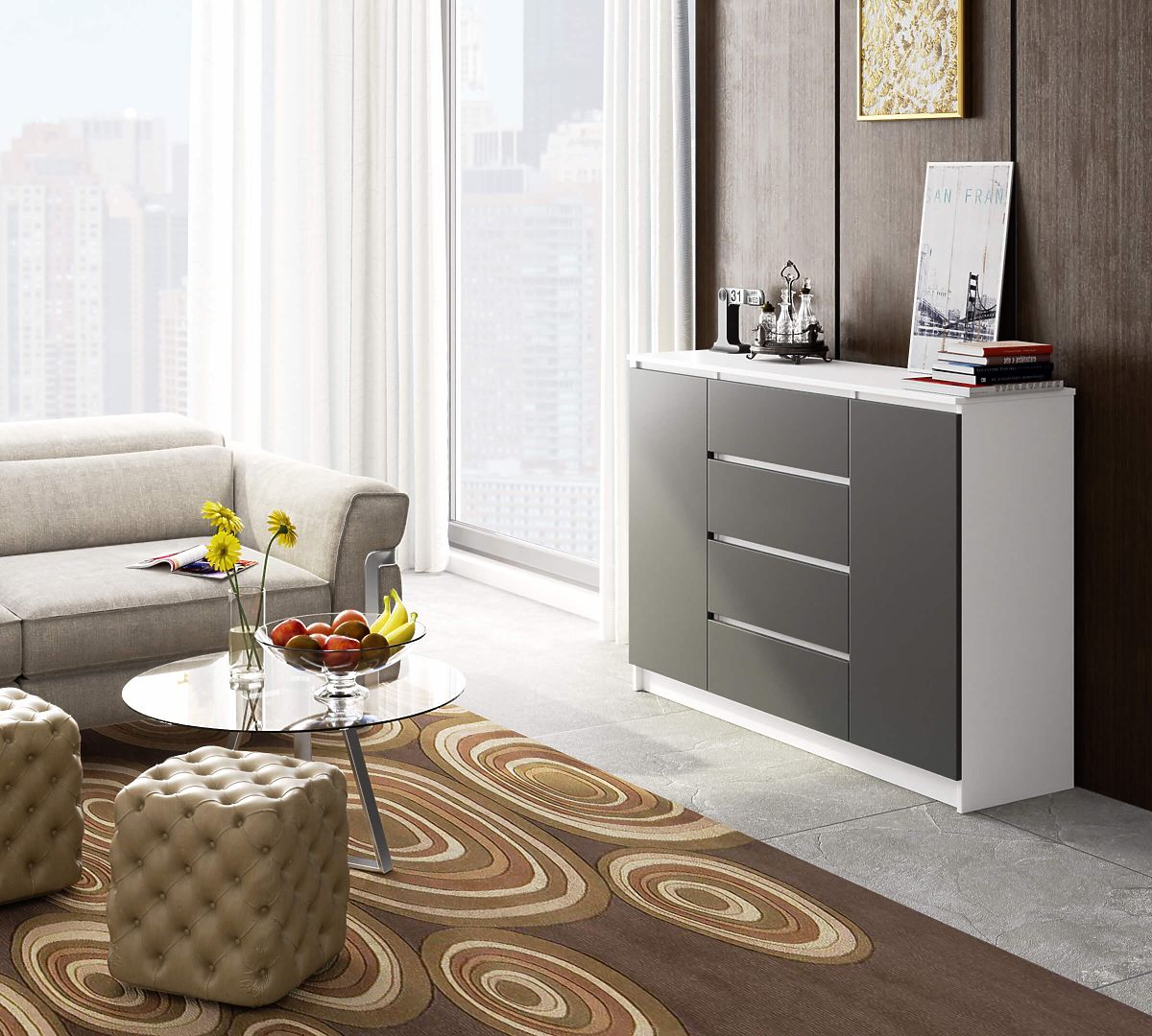 Komoda z białym korpusem i grafitowo-szarymi frontami. .. więcej