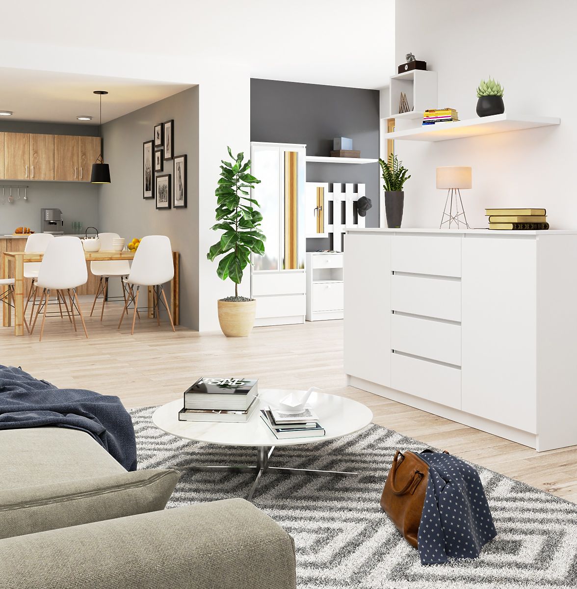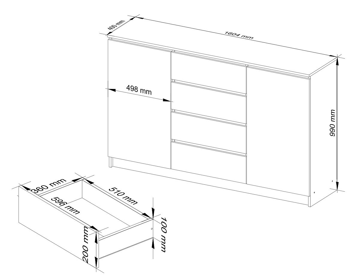Komoda K160 to funkcjonalny mebel, który oferuje wiele wolnej przestrzeni do wykorzystania. Jest w kolorze białym, co czyni ją idealnym wyborem do skandynawskich i minimalistycznie urządzonych wnętrz. Mebel jest prosty w formie, co nadaje mu dużą uniwersalność: można go umieścić zarówno w mieszkaniu, jak i w biurze. Komoda ma długość 160 cm i wysokość 99 cm. Głębokość wynosi 40 cm. Jest wykonana z trwałej laminowanej płyty o grubości 16 mm od producenta Kronospan. Dodatkowo jej krawędzie są oklejone obrzeżem ABS, co zapewnia dodatkową ochronę przed uszkodzeniami. Mebel składa się z dwóch szafek, wewnątrz każdej z nich znajduje się jedna półka. Posiada także 4 szuflady, które poruszają się na metalowych prowadnicach kulkowych. Mebel zapewnia wysoki komfort użytkowania, jest przestronny i funkcjonalny.