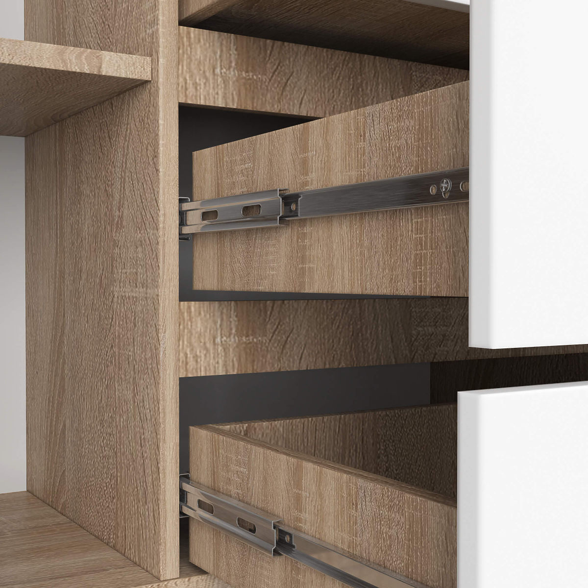 - Szuflady poruszają się na metalowych prowadnicach kulkowych - Krawędzie oklejone obrzeżem ABS zapewniającym wysoką ochronę przed uszkodzeniami