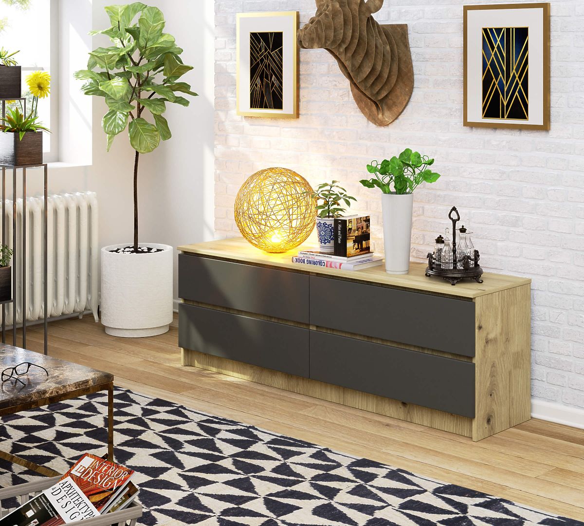 Komoda z czterema szufladami w kolorze dąb artisan i szarym. .. więcej