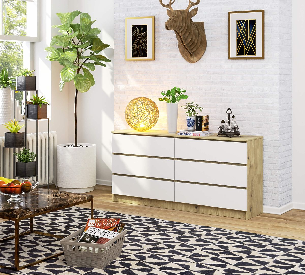 Komoda do salonu K 160 cm to mebel wyposażony w sześć przestronnych szuflad. Połączenie dębu artisan z ponadczasową bielą doprowadziło do stworzenia mebla, który doskonale pasuje do wielu różnorodnych wnętrz. Znajdzie zastosowanie w sypialni, salonie, pokoju studenckim oraz biurze. Komoda będzie pasować do pomieszczeń urządzonych w stylu minimalistycznym, nowoczesnym, skandynawskim, retro i loftowym. To doskonałe połączenie prostoty i elegancji, które docenią nawet najbardziej wymagający.
