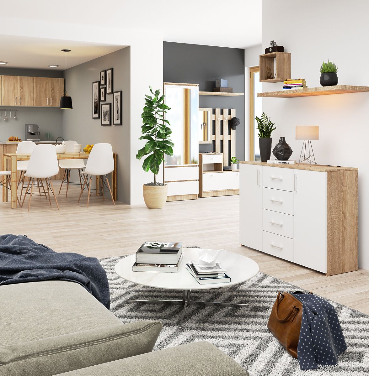 Komoda, model K 45, jest doskonałą odpowiedzią na potrzeby współczesnych użytkowników. Wykonana w matowej bieli z dodatkiem efektownego dębu artisan jest odzwierciedleniem natury i elegancji. Takie niezwykłe rozwiązanie oferuje użytkownikom szerokie pole do aranżacji, które może ograniczać tylko wyobraźnia.