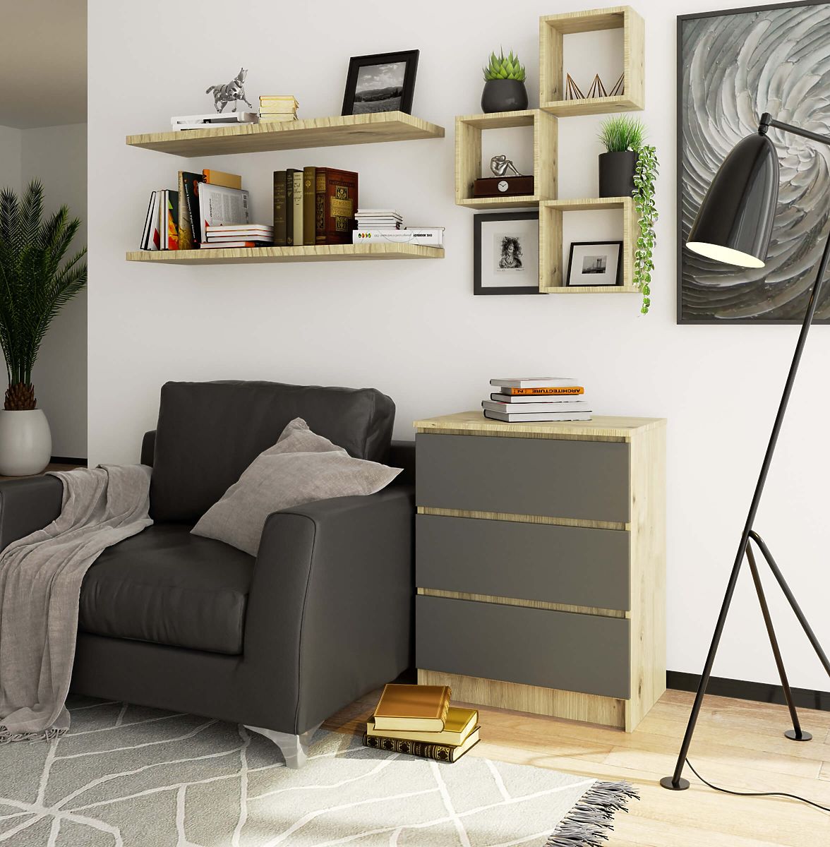 Komoda z trzema szufladami w kolorze dąb artisan i szarym. .. więcej
