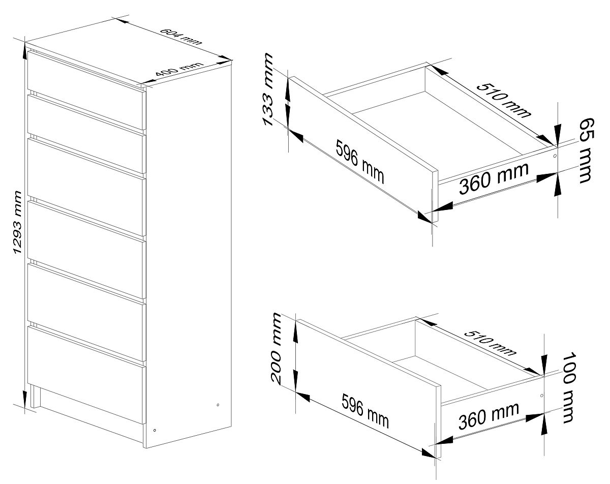 KOMODA K60 6 SZUFLAD Wykonana z płyty laminowanej 16mm odpornej na ścieranie.