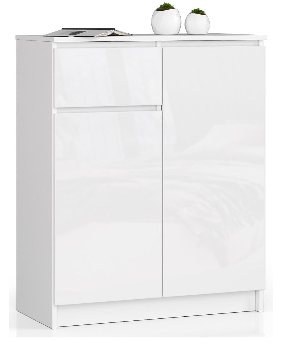 Mała biała komoda wyposażona jest w praktyczną szufladę i dwie zamknięte szafki - w każdej z nich znajdują się dwie półki. Mebel charakteryzuje się solidną konstrukcją i starannym wykonaniem. Prezentowana oferta cieszy oko i spełnia oczekiwania nawet najbardziej wymagających klientów pod względem funkcjonalności. Komoda K 80 cm to połączenie białego korpusu z frontami o wysokim połysku w tym samym kolorze. Gustowny mebel bez wątpienia doskonale wpasuje się w wiele wnętrz urządzonych w stylu skandynawskim, minimalistycznym lub nowoczesnym.