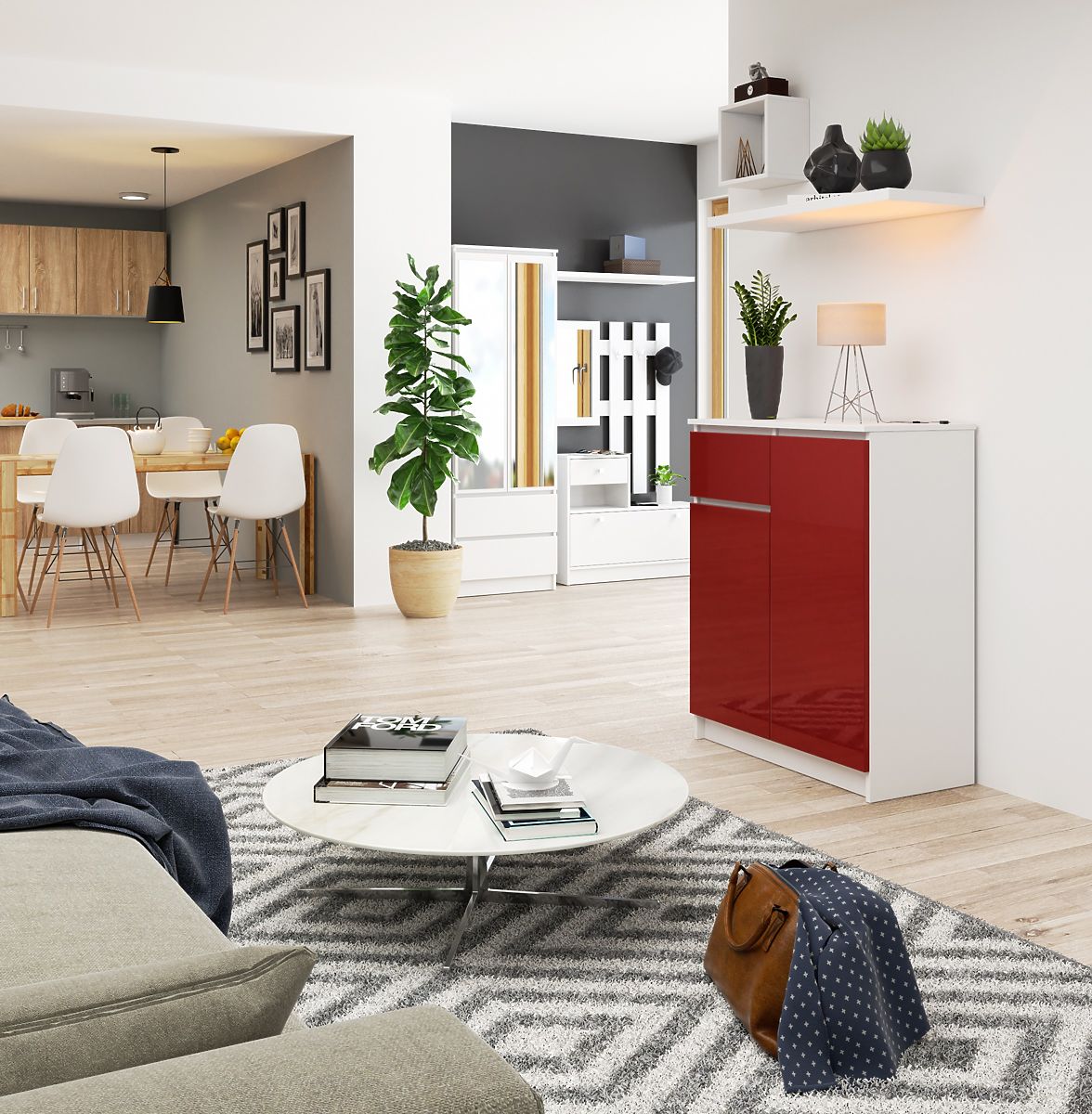 Imponujące czerwone błyszczące fronty z pewnością przyciągną uwagę wszystkich miłośników żywych, oryginalnych kolorów i ciekawie zaprojektowanych mebli, które z pewnością ożywią każde wnętrze. Prezentowany mebel składa się z szuflady i dwóch zamykanych szafek. W każdej z nich znajdują się dwie półki do dowolnego wykorzystania. Komoda K 80 cm to połączenie białego korpusu i czerwonych frontów. Mały mebel doskonale wpasuje się w młodzieżowy lub salonowy pokój, ale znajdzie zastosowanie również w innych pomieszczeniach, w tym biurowych.