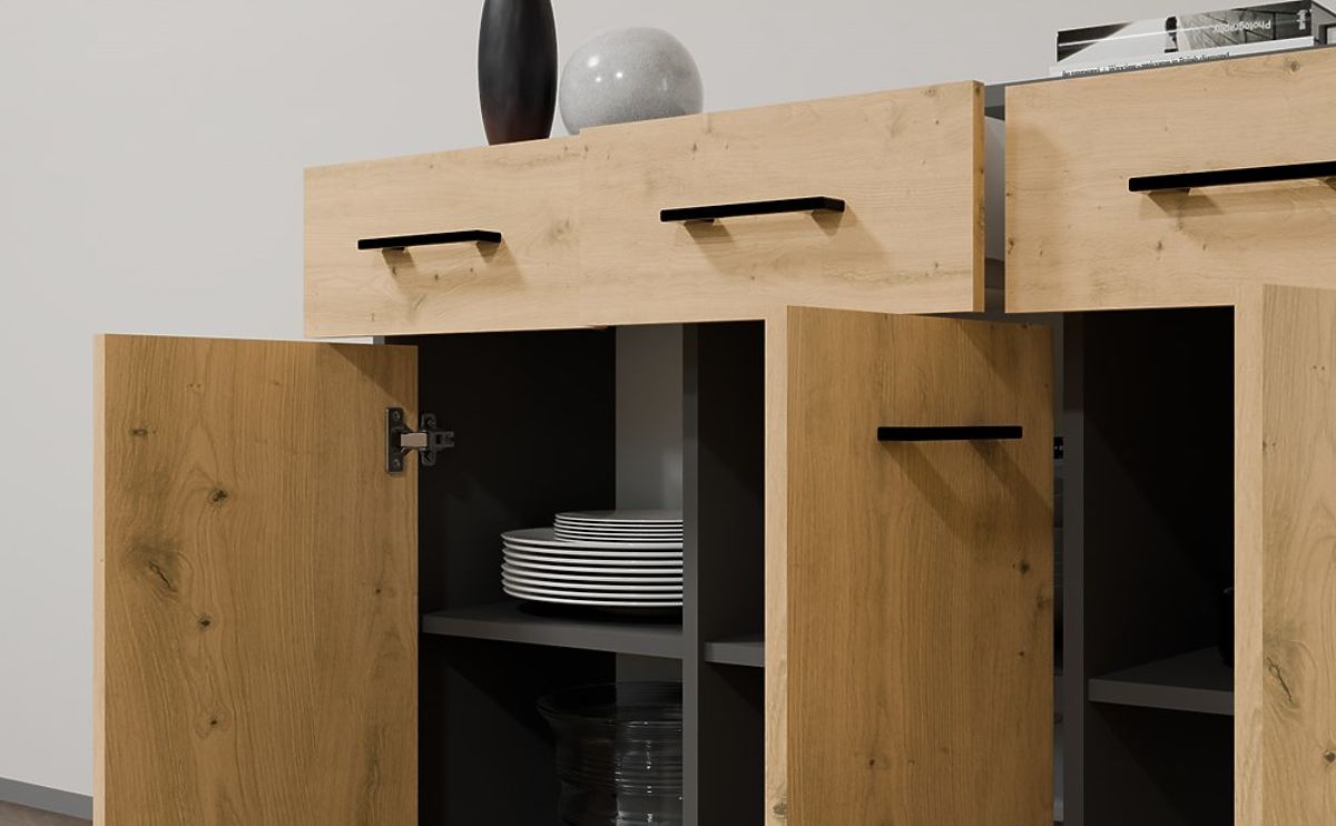 Komoda Simplo 3D3S to połączenie stylu i funkcjonalności, które doskonale sprawdzi się w salonie, sypialni, przedpokoju czy pokoju dziecięcym. Nowoczesne połączenie ciemnego korpusu w kolorze antracytu z naturalnym dekorem frontów dąb artisan wprowadza do wnętrza ciepło i elegancję.