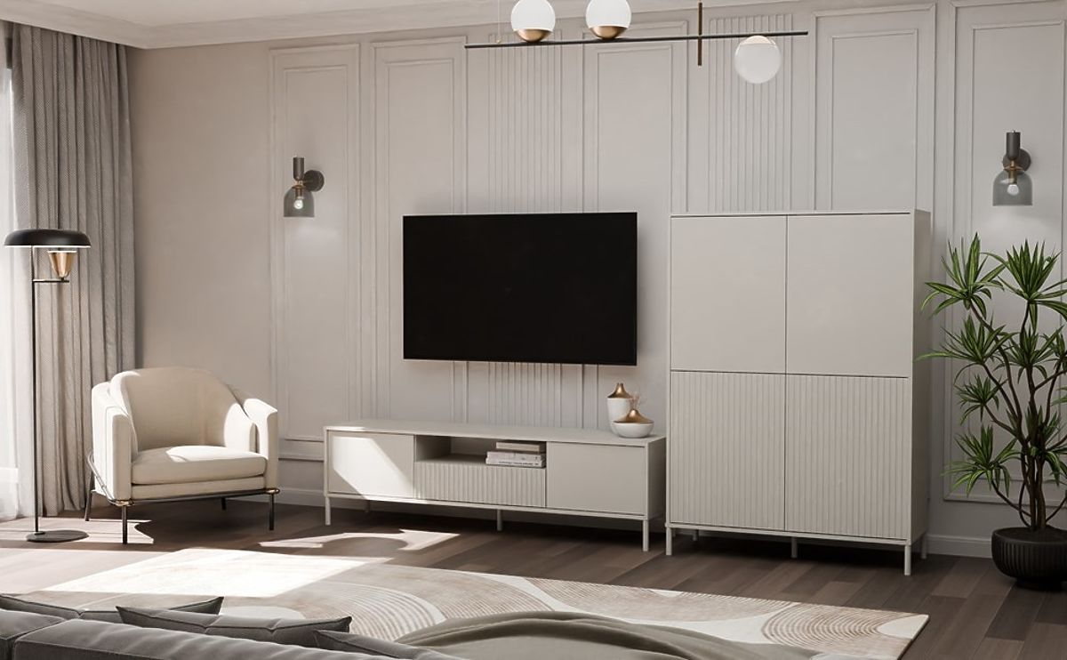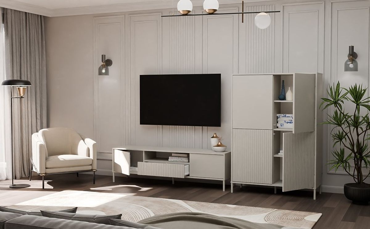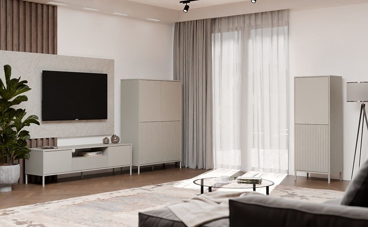 Wykończenie mebla w nowoczesnym kolorze Kaszmir (elegancki odcień beżu) dodaje wnętrzu elegancji i współczesnego charakteru, zachowując neutralność, która łatwo pasuje do różnych stylów dekoracyjnych