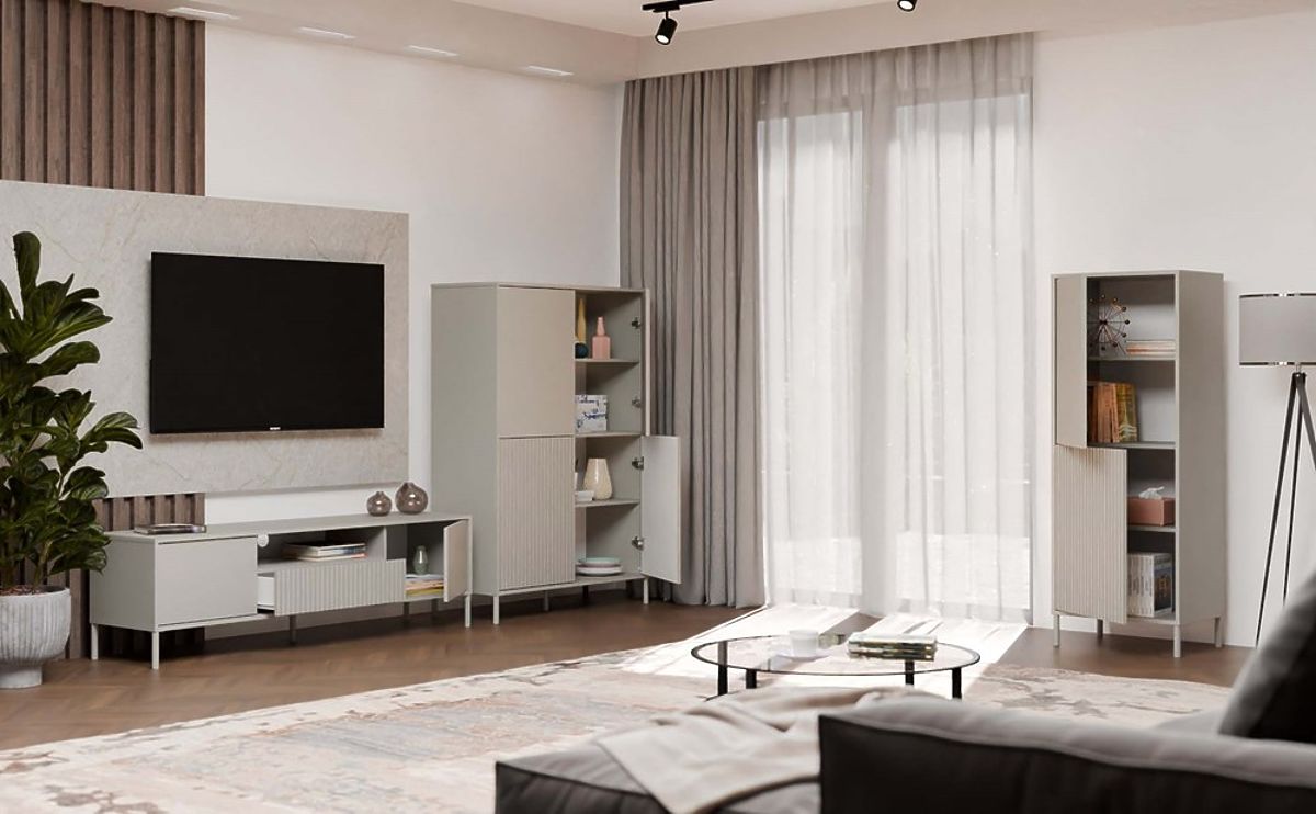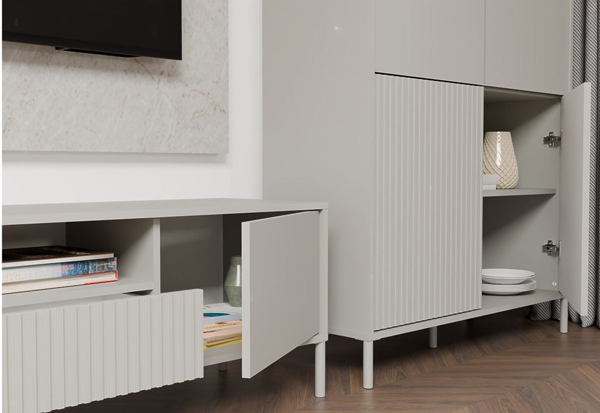 Witryna KAMARO 4DK to nowoczesny i funkcjonalny mebel, który doskonale pasuje do salonu, pokoju gościnnego, sypialni lub gabinetu. Dzięki większej szerokości (103,5 cm) oferuje jeszcze więcej przestrzeni do przechowywania, zachowując jednocześnie elegancki i loftowy charakter. Połączenie drzwi z gładką powierzchnią i drzwi z żłobioną powierzchnią dodaje stylowego kontrastu, a system TIP-ON umożliwia wygodne otwieranie bez uchwytów.