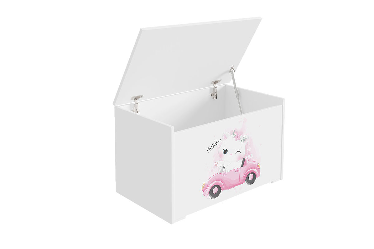 Biała skrzynia na zabawki z nadrukiem kota i gazowym siłownikiem. .. więcej