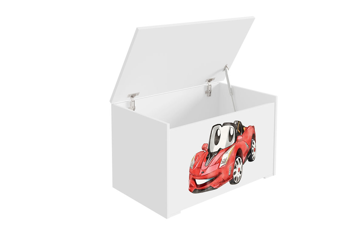 Banaby.pl » Meble dziecięce / Komody i szafy / Skrzynie na zabawki / Skrzynia na zabawki Daria biała z nadrukiem Wyścigowy samochód