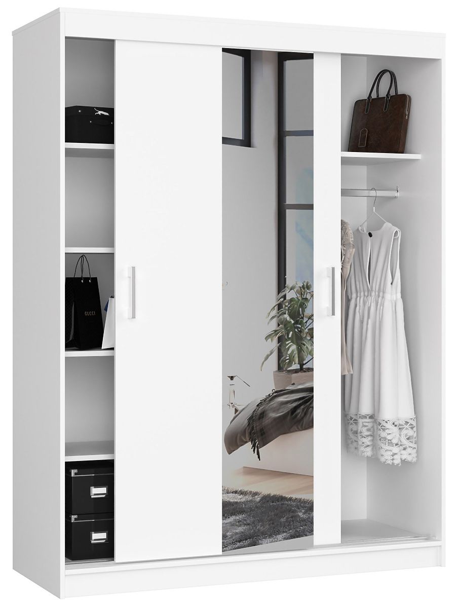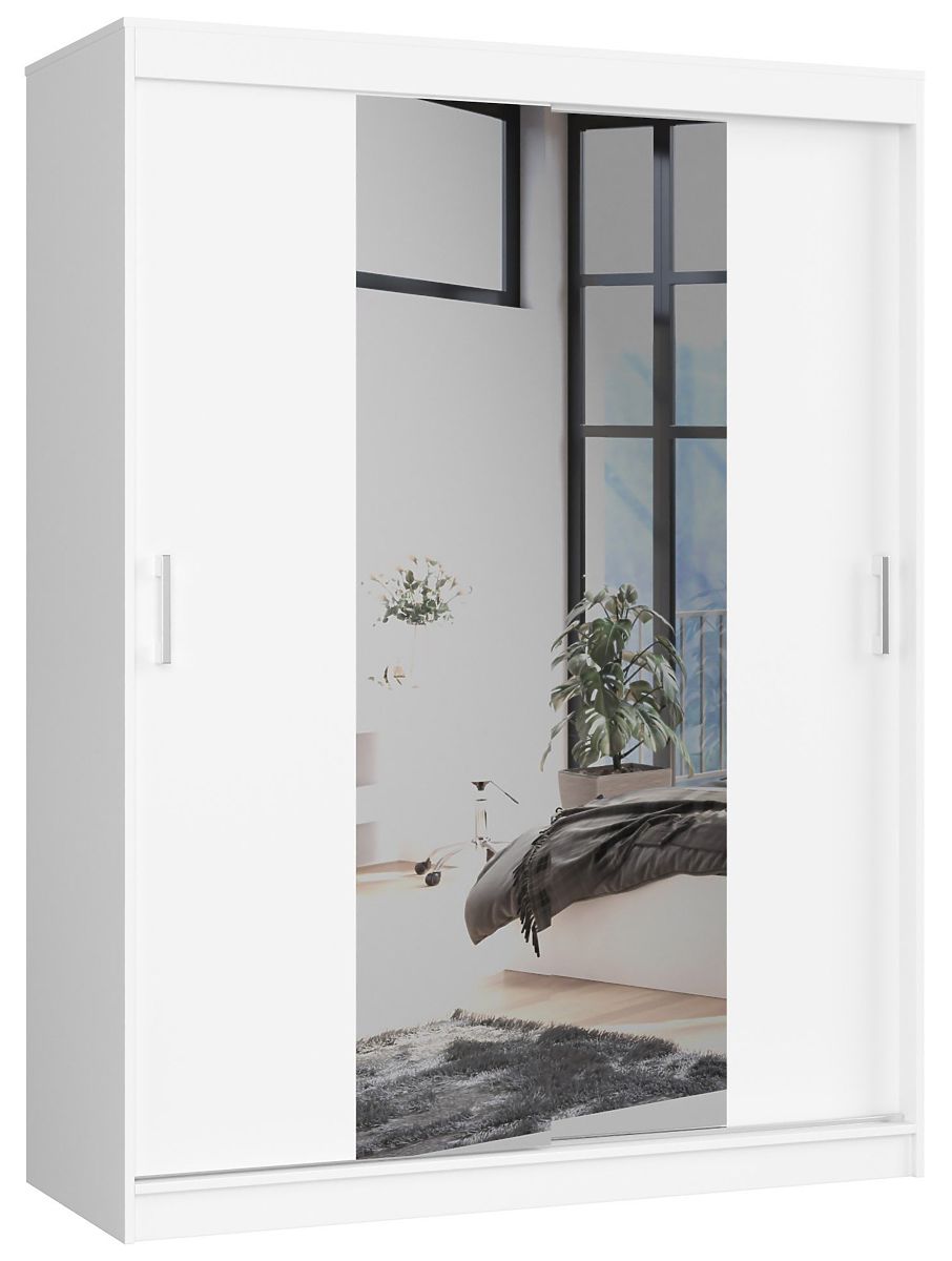 Dwudrzwiowa przesuwna szafa 150 cm CLP z lustrem to biały projekt, który z pewnością sprawdzi się w sypialni, przedpokoju lub pokoju młodzieżowym. Mebel umożliwia przechowywanie ubrań i wielu innych przedmiotów, zapewnia przestrzeń do zawieszenia kurtek, marynarek, koszul, sukienek lub długich płaszczy oraz praktyczne półki. Ten projekt łączy elegancki, minimalistyczny wygląd i wysoką jakość, która jest wynikiem użycia wysokiej jakości materiałów i dbałości o wszystkie detale. Mebel wyposażony jest w duże lustro, które może optycznie powiększyć pomieszczenie.