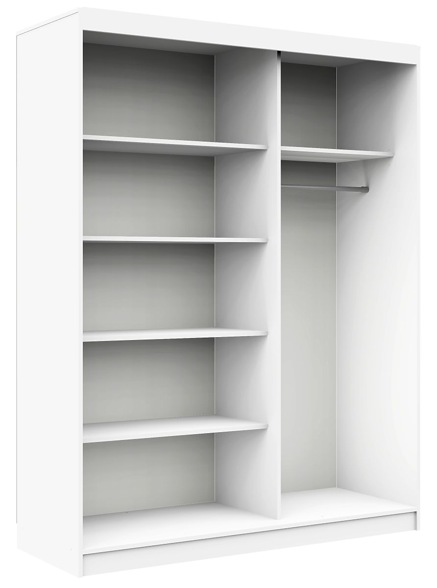 Biała przesuwna szafa 150 cm z półkami i drążkiem na ubrania. Duża powierzchnia do wykorzystania.