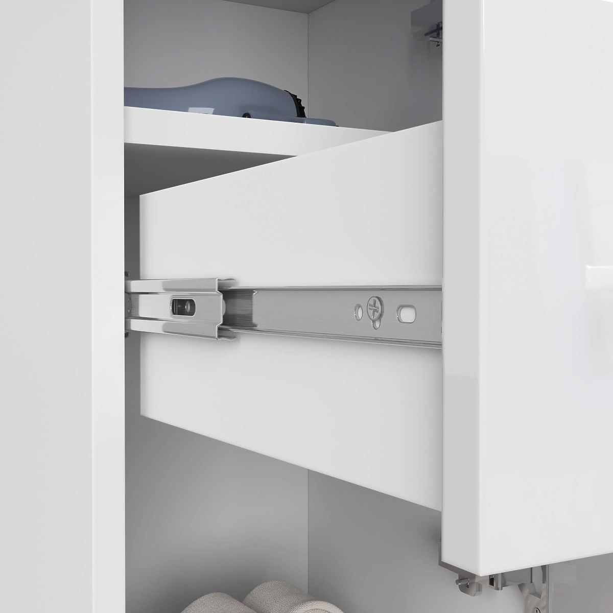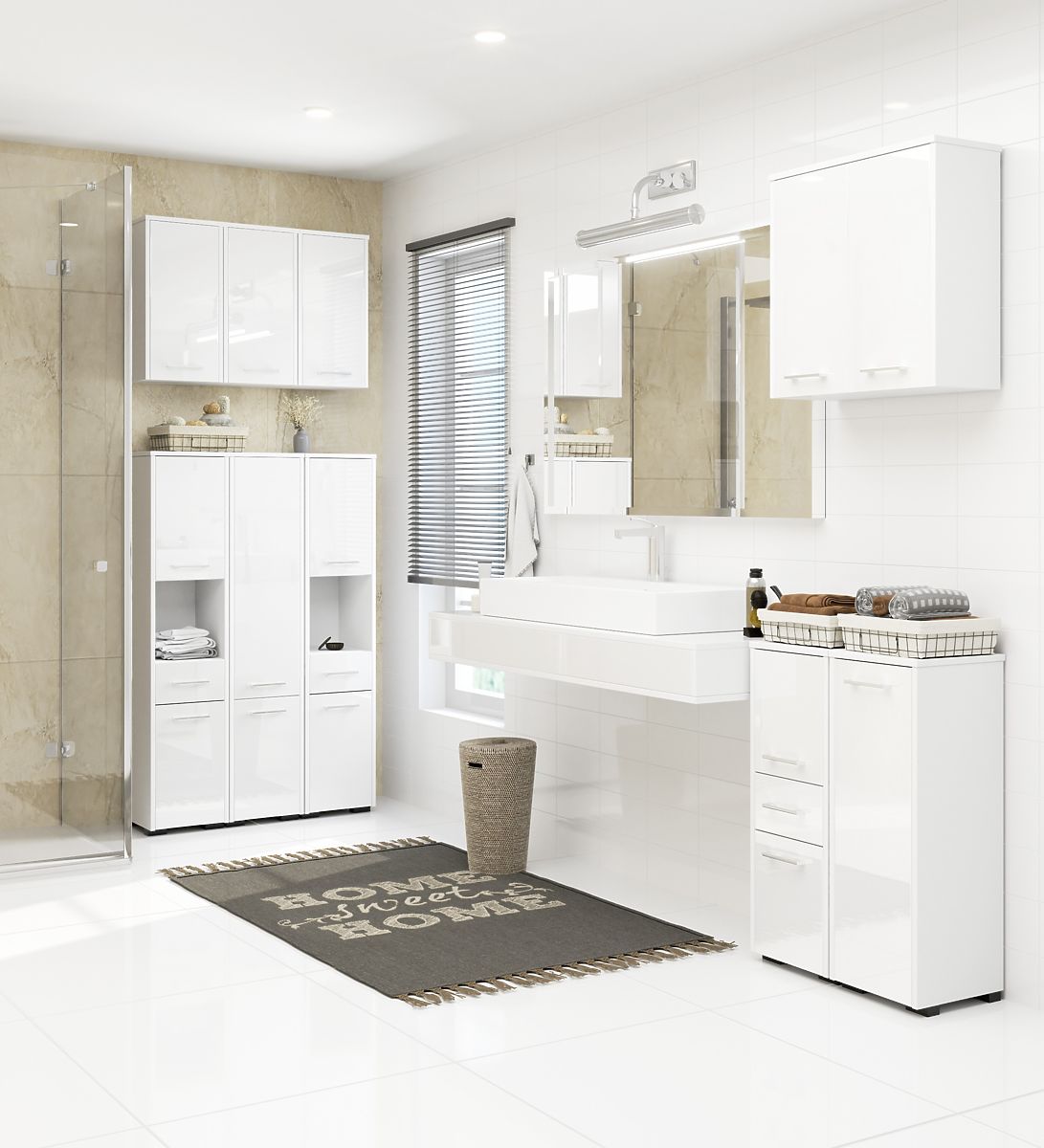 Szafka łazienkowa z białym połyskiem i funkcjonalnym designem. .. więcej