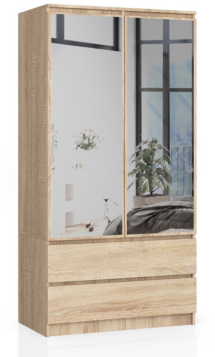 Nowoczesna szafa z lustrami o szerokości 90 cm w kolorze dąb sonoma z półkami i drążkiem na ubrania.