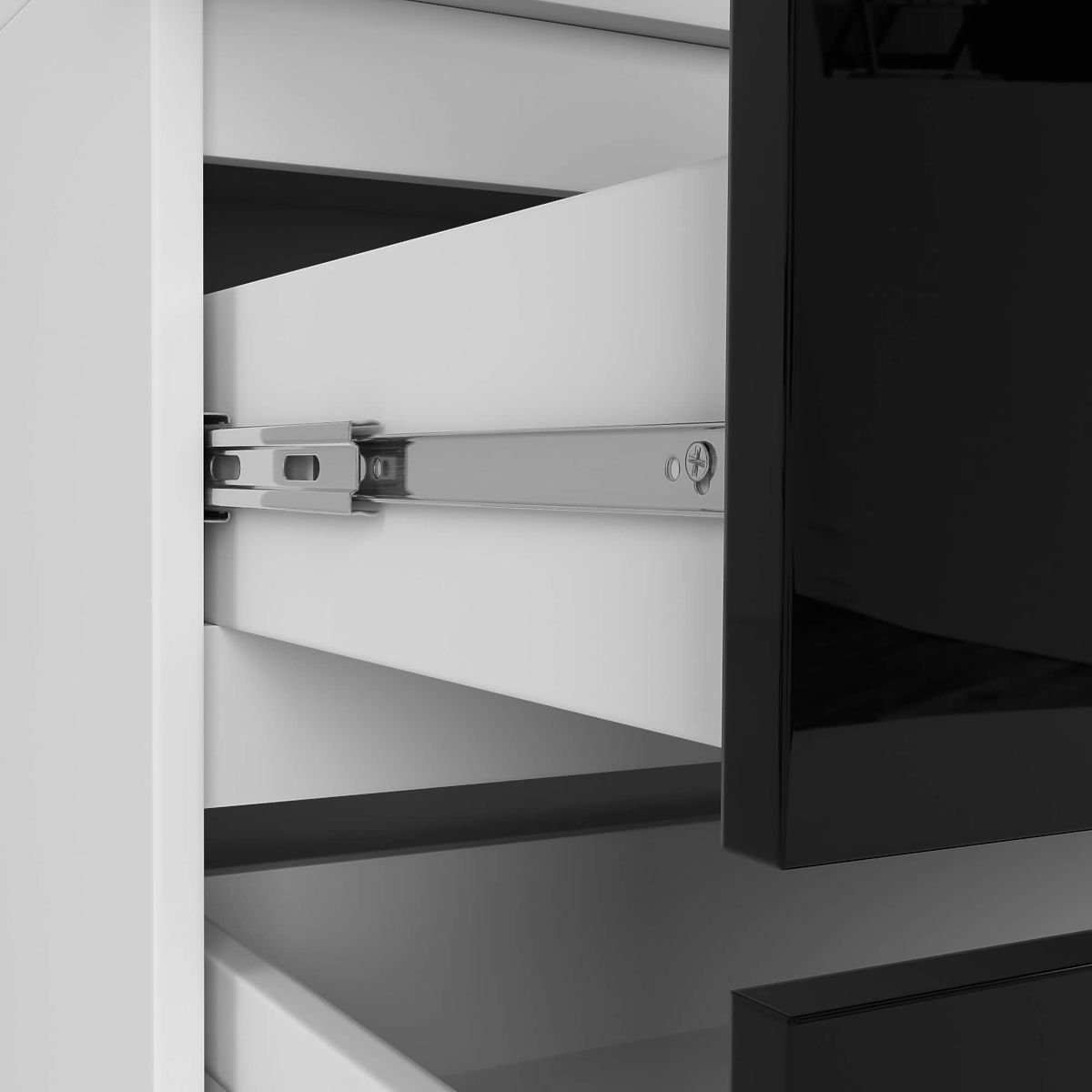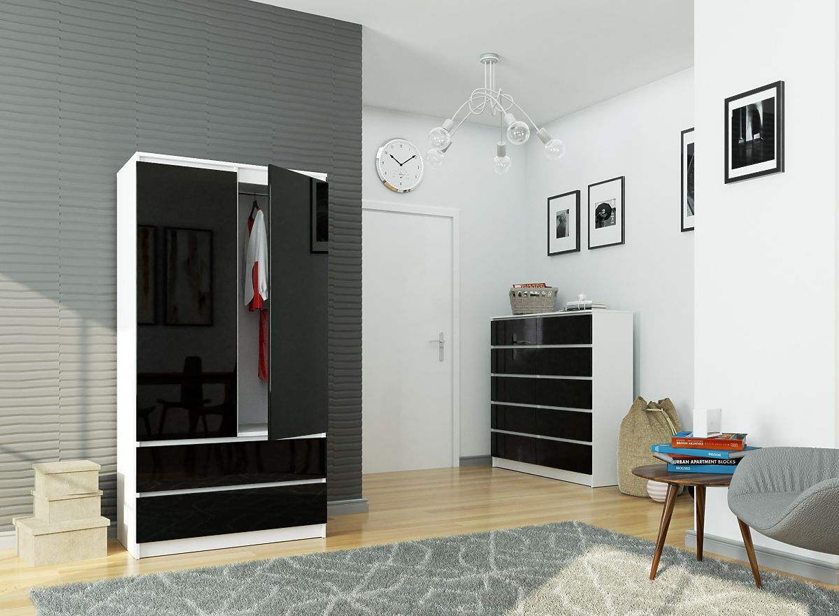 Meble charakteryzują się dość prostą konstrukcją, jednak nie można im odmówić funkcjonalności. W górnej części składają się z czterech półek i miejsca na zawieszenie ubrań ze specjalnie zamontowanym drążkiem, w dolnej części mają dwie szuflady na metalowych prowadnicach kulkowych GTV. Zastosowane rozwiązania sprawiają, że szafa – mimo lekkiego wyglądu – jest niezwykle pojemna. W prezentowanym modelu połączenie dwóch przeciwstawnych wariantów kolorystycznych – głębokiej czerni i surowej bieli – nadaje całemu zestawowi elegancji i nowoczesnego wyglądu, które dodatkowo podkreśla zastosowanie powierzchni o wysokim połysku.