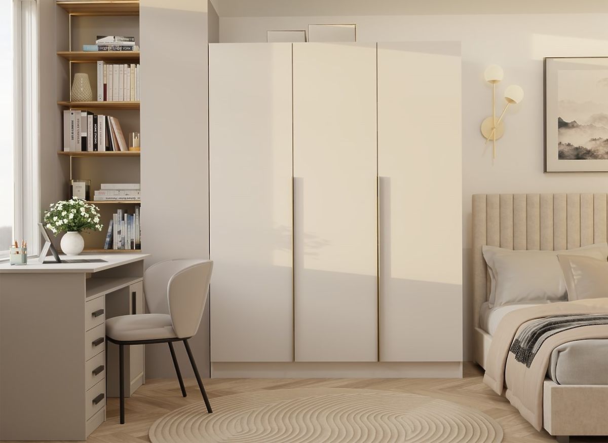 SZAFKA SENSO 3D 150 CM 3 DRZWI ZŁOTE UCHWYTY DO SALONU SYPIALNI KASZMIR BEŻOWA