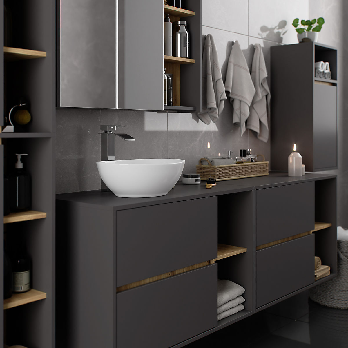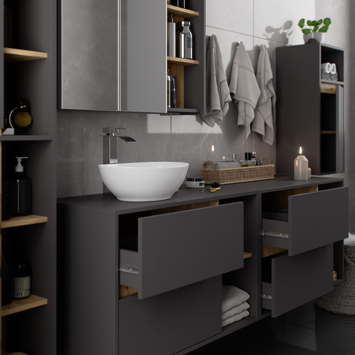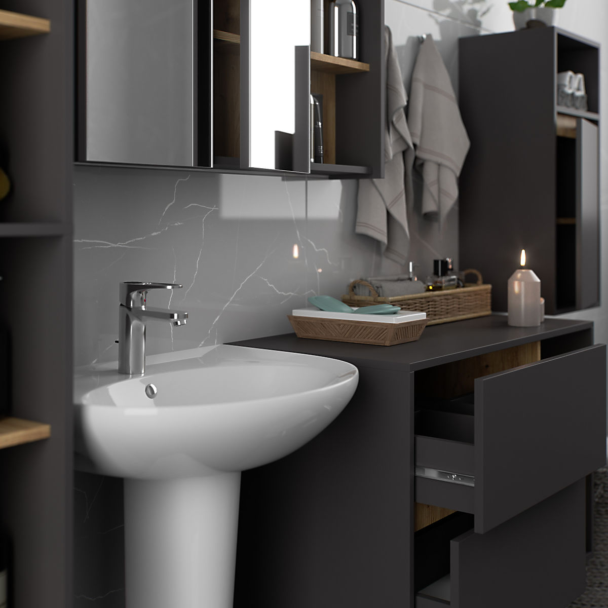 Szafki łazienkowe doskonale uzupełniają wyposażenie łazienki, zapewniając niezbędne miejsce na wszelkie kosmetyki i detergenty oraz dodając łazience pewien styl. Przestronne szafki ułatwiają utrzymanie porządku w pomieszczeniu, co korzystnie wpływa na estetykę wnętrza. Kolekcja VAMI charakteryzuje się przyciągającą wzrok stylową kolorystyką – korpus i fronty mają ten sam kolor, podczas gdy wnętrze jest w innym odcieniu.