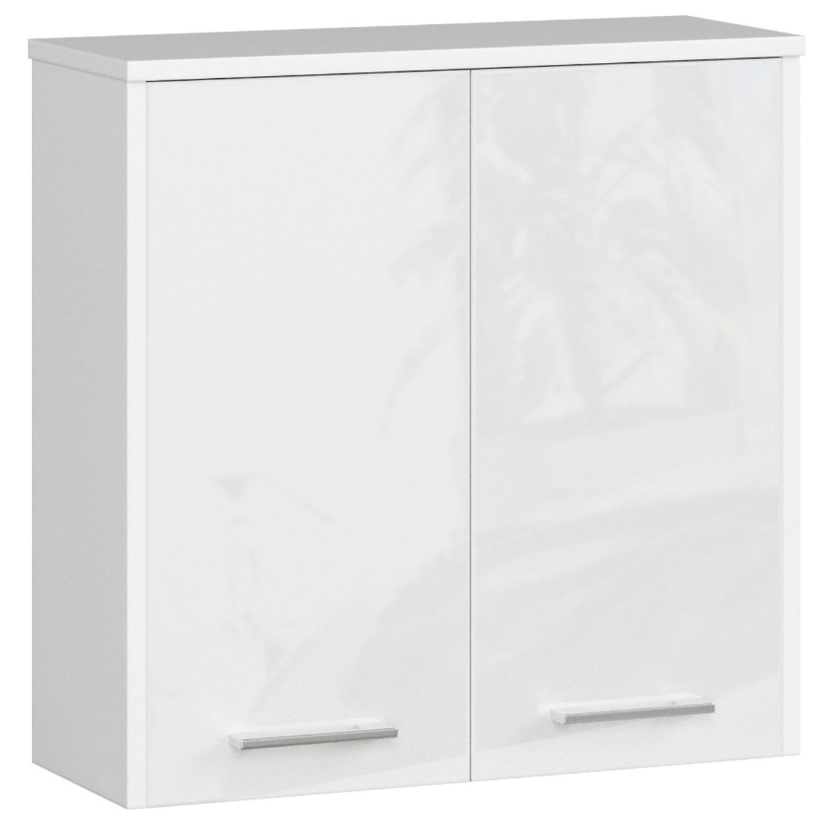 Wisząca szafka łazienkowa z białym połyskiem i dwoma drzwiami. .. więcej