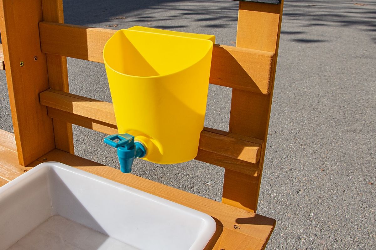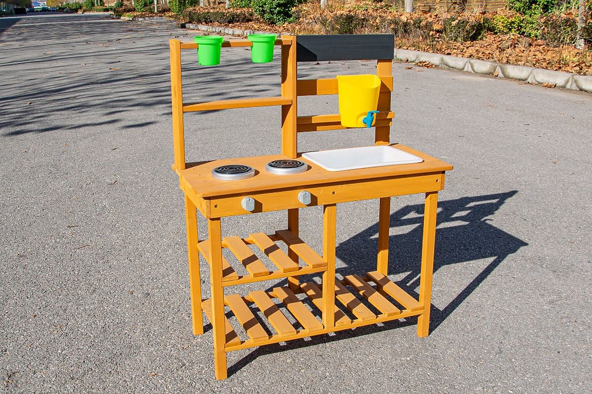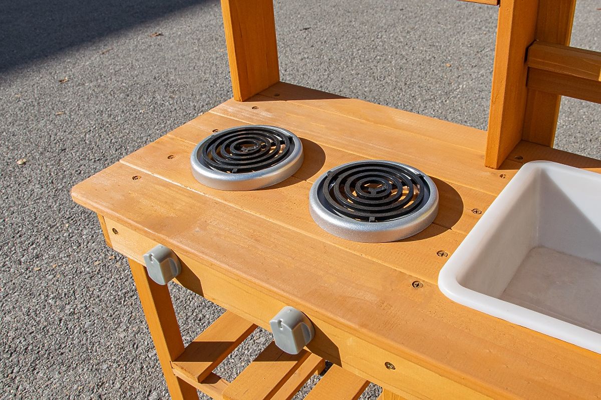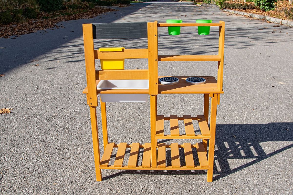 Pozwól dzieciom cieszyć się przekąską na świeżym powietrzu, w otoczeniu natury. W miejscu, gdzie potrawy pachną świeżym wiatrem, a słońce opieka bochenki z piasku i wody, powstaje przestrzeń do zabawy pełnej fantazji. Ta kuchnia ogrodowa oferuje doskonałą okazję do rozwijania kreatywności, samodzielności i umiejętności kulinarnych dzieci podczas zabawy na świeżym powietrzu. Kuchnia jest wyposażona w przydatne elementy, takie jak dzbanek z kranem, umywalka, dwie płyty do gotowania i dwa doniczki. Nie brakuje również obszernej przestrzeni do przechowywania, która jest idealna do przechowywania wszystkich akcesoriów. A jakie jest dzisiaj menu? Czysta fantazja! Główne cechy: kompaktowe wymiary, wielofunkcyjne i różnorodne zastosowanie, obszerna przestrzeń do przechowywania.