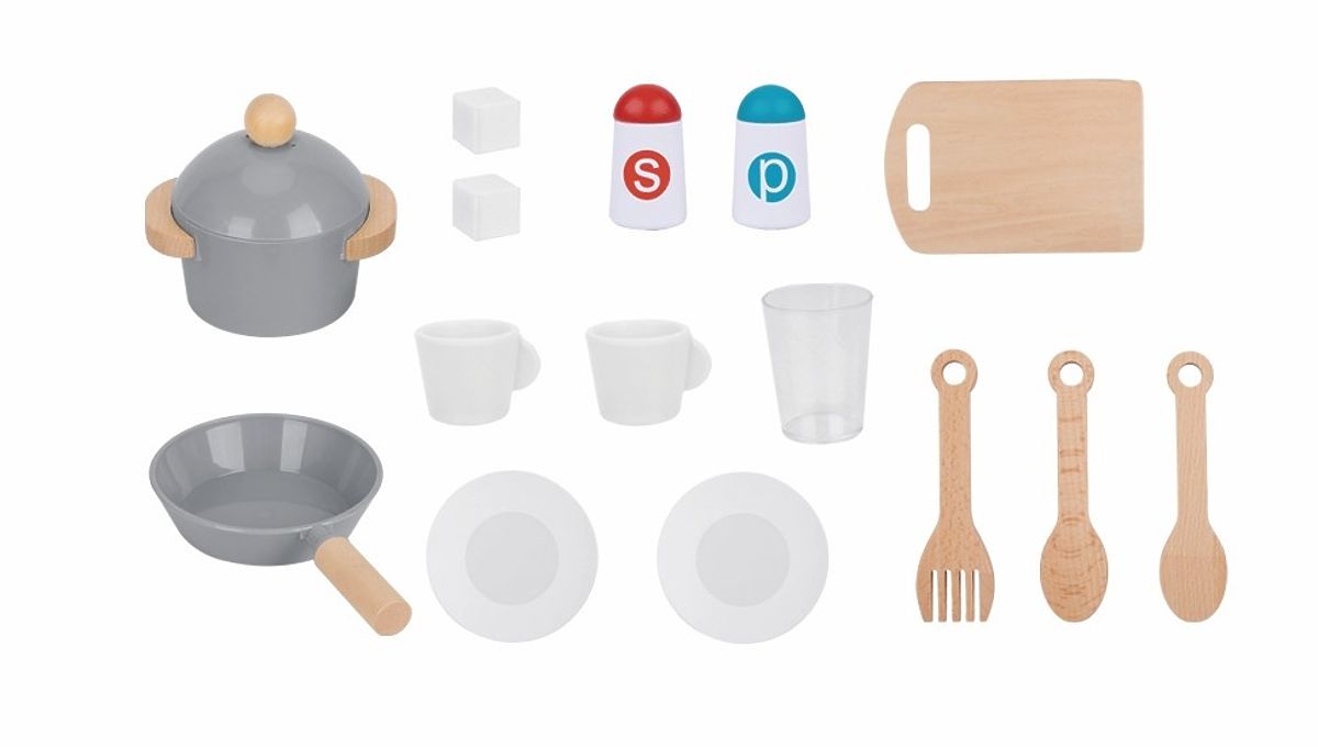 Duża kuchnia to idealna zabawka dla wszystkich dzieci, które uwielbiają gotować. Oferuje doskonałą możliwość rozwijania kreatywności, samodzielności i doskonalenia umiejętności kulinarnych. Kuchnia ma nowoczesny wygląd w stylowej kombinacji szarego koloru i złotych dodatków ze wszystkimi niezbędnymi urządzeniami, ważnymi naczyniami i przyborami. Wyposażona jest w płytę grzewczą z czerwonymi świecącymi palnikami (można je włączać i wyłączać), piekarnik i kuchenkę mikrofalową, ekspres do kawy, lodówkę z kostkarką do lodu z 2 kostkami lodu, zmywarkę i zlew. Do przygotowywania potraw mali kucharze wykorzystają garnek z pokrywką, patelnię, deskę do krojenia, łyżki i łopatkę. Do serwowania dostępne są talerze, kubki, szklanki oraz solniczka i pieprzniczka. Główne cechy: wyposażona w urządzenia, naczynia i przybory, różne przestrzenie do przechowywania, otwierane drzwiczki, palniki płyty grzewczej można zapalić, wspiera dzieci w długotrwałej wyobraźni, rozwija zabawę w role i umiejętności społeczne. 2xAA baterie nie są dołączone do zestawu. Wykonana z drewna z certyfikatem FSC®. Marka i certyfikat FSC® (Forest Stewardship Council) gwarantuje, że drewno, z którego produkt został wykonany, nie zostało pozyskane nielegalnie i pochodzi z lasów zarządzanych w sposób zrównoważony lub bliski naturze, gdzie przestrzegane są surowe wymagania środowiskowe i społeczne. Znak FSC® na produkcie oznacza, że poprzez zakup pomagasz chronić lasy i wspierasz zrównoważone, odpowiedzialne lub bliskie naturze gospodarowanie, dzięki czemu nasze lasy są bardziej stabilne, zdrowsze, mają naturalny skład gatunkowy i lepiej radzą sobie z negatywnymi skutkami zmian klimatycznych.