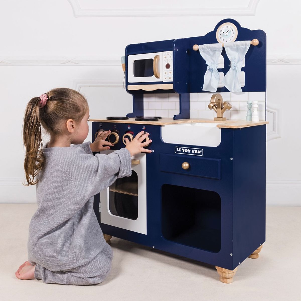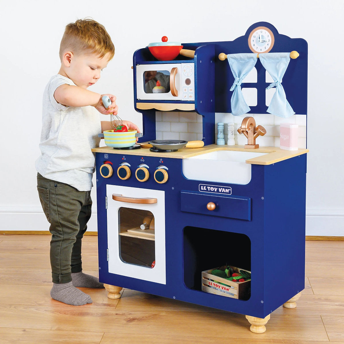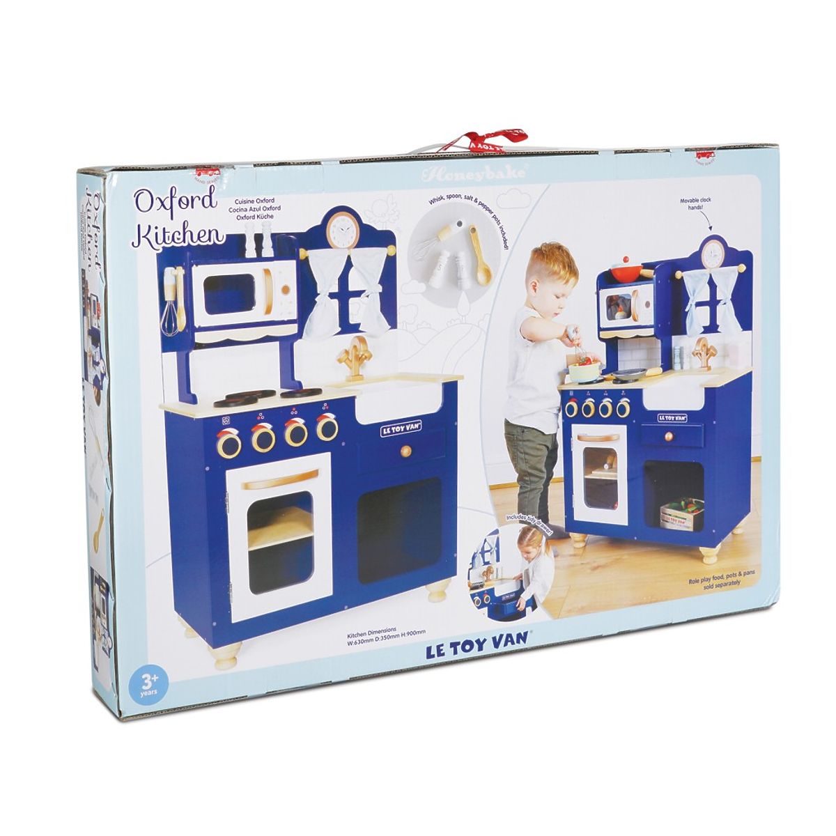 Kuchnia Oxford jest wykonana z solidnego i zrównoważonego drewna, a jej oryginalny design czyni ją unikalnym elementem. Jest pomalowana na odcień królewskiego błękitu, a jej detale są w kolorze miedzi. Ta tradycyjna zabawka będzie pasować do każdego pokoju dziecięcego, zachęcając dzieci do kreatywnej zabawy w role. Wśród jej funkcji znajdują się otwierane drzwi piekarnika, obrotowe pokrętła, zlew, mikrofalówka, urocze okno z zasłonami i zegar z ruchomymi wskazówkami. W zestawie znajdziesz także trzepaczkę, łyżkę, solniczkę i pieprzniczkę. Wszystko dla małych szefów kuchni. Kuchnię można uzupełnić jedzeniem i dodatkami z kolekcji Honeybake od Le Toy Van. Piękna zabawka, którą można przekazywać z pokolenia na pokolenie. Zabawki z celemWszystkie zabawki firmy Le Toy Van są tworzone z myślą o długowieczności. Projektowane z miłością przez doświadczonych rzemieślników przy użyciu etycznych praktyk i zrównoważonych materiałów, które są przyjaźniejsze dla naszej planety. Główne cechy: drewniana kuchnia z dodatkamiwykonana etycznie z zrównoważonego drewna testowana zgodnie z najsurowszymi standardami malowana nietoksycznymi farbami na bazie wody inspiruje do kreatywnej i wyobraźniowej zabawy pomaga w rozwoju mowy i umiejętności społecznych wspiera w wczesnym rozwoju Kolekcja Honeybake: Zabawki z tej kolekcji są odpowiednie do odkrywania, pomagają dzieciom w rozwoju wyobraźni, umiejętności społecznych i werbalnych oraz funkcji poznawczych. Tradycyjny design z nowoczesnymi detalami z pewnością spodoba się dzieciom. Honeybake to kolekcja Le Toy Van, która zdobyła najwięcej nagród za design, jakość, bezpieczeństwo oraz wartość edukacyjną i zabawową.