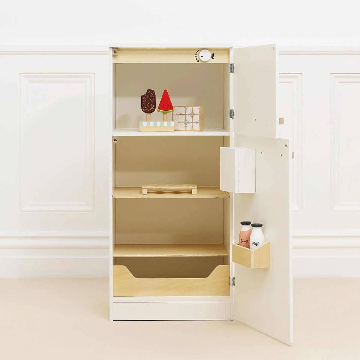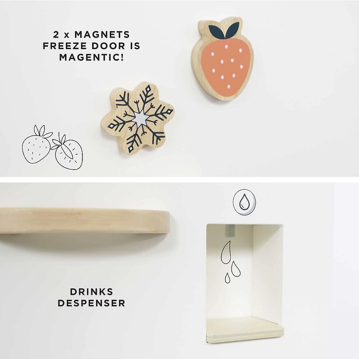 Ulepsz swoją kuchnię dzięki tej niesamowitej wolnostojącej lodówce z zamrażarką! Trwała zabawka o atrakcyjnym retro designie jest pełna interaktywnych funkcji dla większej zabawy i bardziej pomysłowej zabawy w role. Odkryj wbudowany dozownik wody, kontrolę temperatury czy przegródki na owoce i warzywa. Kompletny zestaw zawiera również szereg akcesoriów, w tym 2 lody na patyku, stojak, tacki na jajka i lód oraz butelkę na mleko lub smoothie. Drzwi lodówki są magnetyczne, a dodatkowo znajdują się tam dwa praktyczne, ozdobne magnesy. Lodówka jest kompatybilna z dużą kuchnią Le Toy Van (kod TV347). Zestaw wykonany jest z drewna z certyfikatem FSC® (drewno z lasów zarządzanych w sposób zrównoważony) i ozdobiony farbami na bazie wody bezpiecznymi dla dzieci. Zabawki z celemWszystkie zabawki firmy Le Toy Van są tworzone z myślą o długowieczności. Projektowane z miłością przez doświadczonych rzemieślników przy użyciu etycznych praktyk i zrównoważonych materiałów, które są bardziej przyjazne dla naszej planety. Główne cechy: wykonane etycznie z drewna zrównoważonego FSC malowane nietoksycznymi farbami na bazie wody testowane według najsurowszych standardów zawiera lodówkę z zamrażarką, 2 magnesy, tackę na kostki lodu, tackę na jajka, 2 lody na patyku, 2 butelki, dozownik wody inspiruje do pomysłowej zabawy Znak i certyfikat FSC® (Forest Stewardship Council) gwarantuje, że drewno, z którego produkt został wykonany, nie zostało pozyskane nielegalnie i pochodzi z lasów zarządzanych w sposób zrównoważony lub bliski naturze, w którym przestrzegane są surowe wymagania środowiskowe i społeczne. Znak FSC® na produkcie oznacza, że swoim zakupem pomagasz chronić lasy i wspierasz zrównoważone, odpowiedzialne lub bliskie naturze gospodarowanie, dzięki któremu nasze lasy są bardziej stabilne, zdrowsze, mają naturalny skład gatunkowy i lepiej radzą sobie z negatywnymi skutkami zmian klimatycznych.