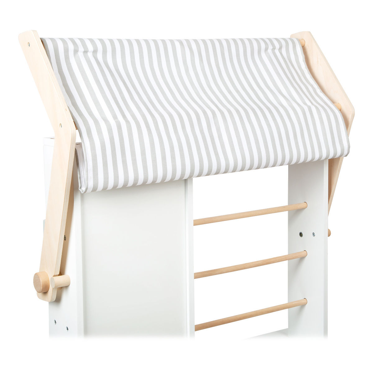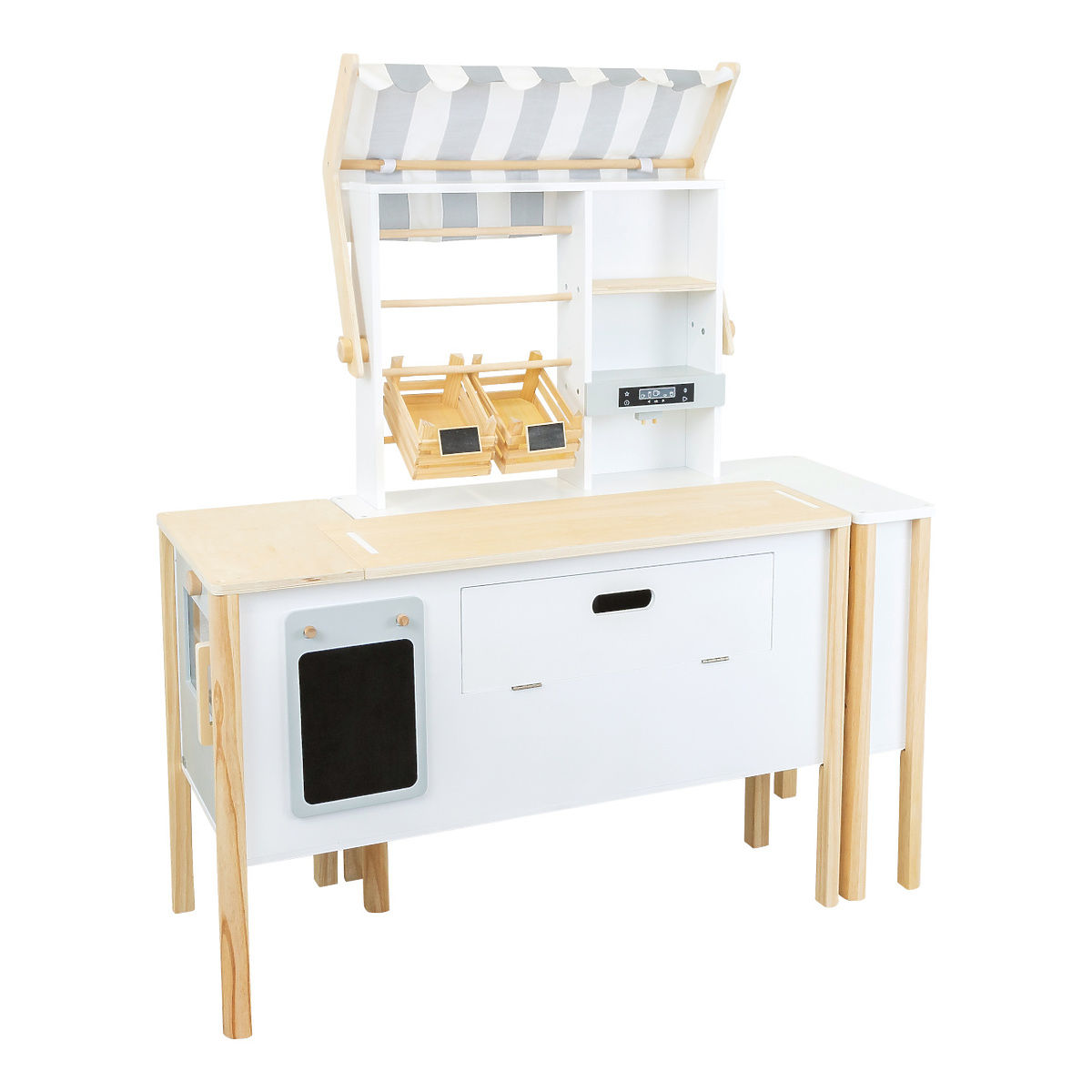 Stoisko sprzedażowe, kiosk czy bufet? Duże stoisko w nowoczesnym skandynawskim designie jest modułowe i wielofunkcyjne, składa się z wielu części, które można w kilka chwil przebudować i uporządkować pod kątem wolnej przestrzeni w domu. Zmienne elementy gry można wykorzystać na kilka sposobów, np. kasę zamienić w zlew, płytę kuchenną w grill, a piekarnik zamienić w lodówkę. W wyposażeniu znajdziemy również wagę, składane półki, tablice do etykietowania, a także ekspres do kawy oraz schowki z 2 skrzyniami. Markizę małego blatu można złożyć w celu zaoszczędzenia miejsca (jej osłona może różnić się kolorem). Stojak oferuje wystarczająco dużo miejsca, aby jednocześnie bawić się kilkoro dzieci. Naśladując codzienne sytuacje, dzieci uczą się, jak to jest być sprzedawcą, klientem, jak to jest gotować czy zajmować się ludźmi. Produkt wymaga montażu, dostarczany z obrazkową instrukcją montażu. Główne cechy: wielofunkcyjne, różnorodne zastosowanie, modułowa konstrukcja ze zmiennym wyposażeniem rozwija umiejętności komunikacyjne i społeczne dzieci