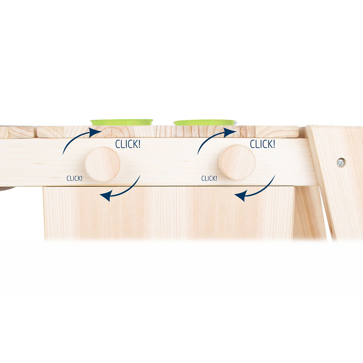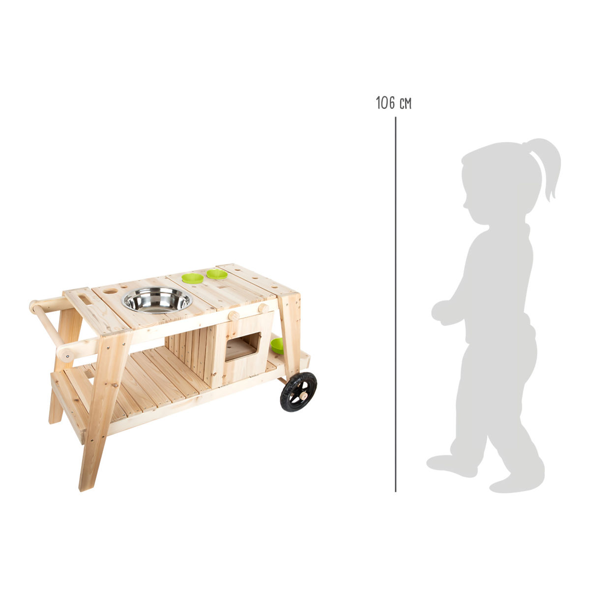Kto woli gotować na zewnątrz, na słońcu i świeżym powietrzu? Dla niego idealna będzie kuchnia, która swoją kolorystyką wtapia się w przyrodę. Wyposażona w duże kółka, z pomocą dorosłego można ją przenosić nawet po nierównym terenie. Oferuje solidną i trwałą konstrukcję z nieimpregnowanego naturalnego drewna, które zachęca do pomalowania według własnej fantazji. Jej przestronny blat roboczy jest dostępny ze wszystkich stron i można go łatwo wykorzystać do wielu różnych czynności. Kuchnia oferuje piekarnik z drzwiczkami z magnetycznym zamknięciem i parą pokręteł, które podczas obracania wydają klikające dźwięki, pieczenie jak prawdziwe! Wewnątrz piekarnika znajduje się praktyczna drewniana deska, którą można wykorzystać według potrzeb, nie tylko jako blachę do pieczenia. Pojemne schowki mogą służyć do przechowywania zarówno kuchennych, jak i ogrodowych narzędzi. Do tego kuchnia wyposażona jest w liczne otwory i wieszaki na różne przybory. W skład kuchni wchodzi większa misa, mniejsze miski i doniczki, wszystko wykonane z trwałego metalu. Wybierasz się do grządki, piaskownicy, czy przygotować przekąskę przy basenie? Produkt wymaga montażu, dostarczany z ilustrowaną instrukcją montażu. Główne cechy: kuchnia polowa, 2 doniczki, 1 większa misa, 2 mniejsze miski i blat roboczy, piekarnik z drzwiczkami i obrotowymi pokrętłami zapewniającymi dźwiękową odpowiedź, pojemne schowki, otwory i haczyki, wyposażona w kółka, łatwa do przenoszenia, wielofunkcyjna, różnorodne zastosowanie, nieimpregnowane drewno odpowiednie do osobistych modyfikacji i lakierowania