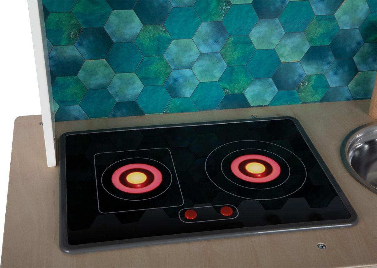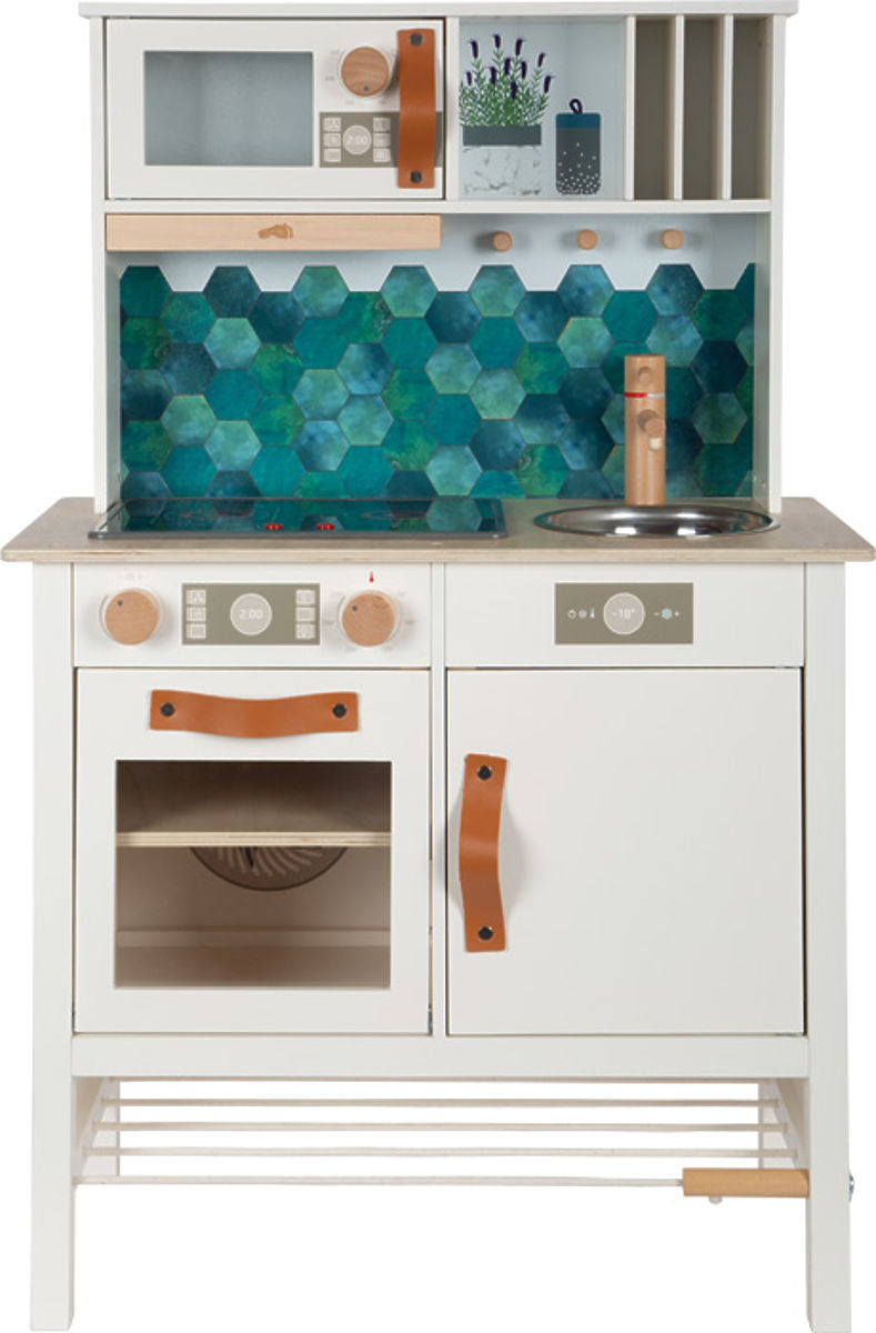 Film jest jedynie ilustracyjny. Nowoczesna dziecięca kuchnia o solidnej konstrukcji w modnym białym kolorze, w połączeniu ze stylowymi skórzanymi uchwytami w kolorze koniakowym. Natychmiast gotowa do zabawy dzięki dołączonemu garnkowi z pokrywką, patelni i metalowym przyborom kuchennym. Wyposażona w metalowy zlew i obrotowe pokrętła, które wydają dźwięk. Zawiera elektroniczną płytę grzewczą ze światłem i dźwiękiem oraz wysuwaną okap z symbolem świetlnym. Wyjmowany piekarnik można również używać jako tablicę do rysowania. Powierzchnie w lodówce i piekarniku są ozdobione kuchennymi detalami dla większej zabawy podczas zabawy. Dwustronny panel tylny z wysokiej jakości nadrukiem w wyglądzie płytek lub prostym białym kolorze. Można idealnie uzupełnić innymi produktami i sprzętem kuchennym z kolekcji Tasty. Główne cechy: metalowe dodatki i akcesoria, funkcjonalne elementy jak klikające pokrętła, płyta grzewcza z efektem światła i dźwięku, nowoczesny design, zasilanie - 2xAA baterie (nie są dołączone do zestawu), możliwość uzupełnienia produktami z kolekcji Tasty.