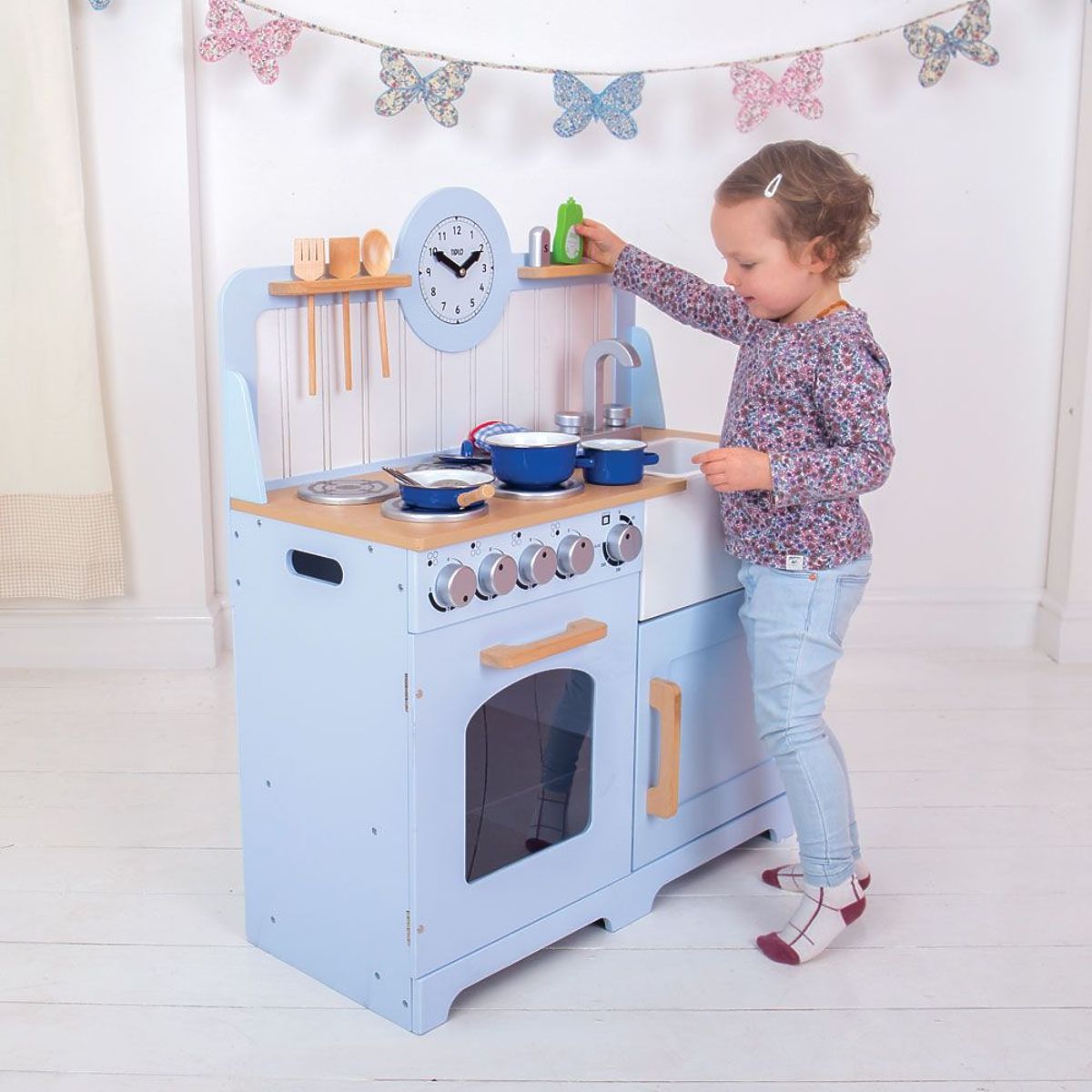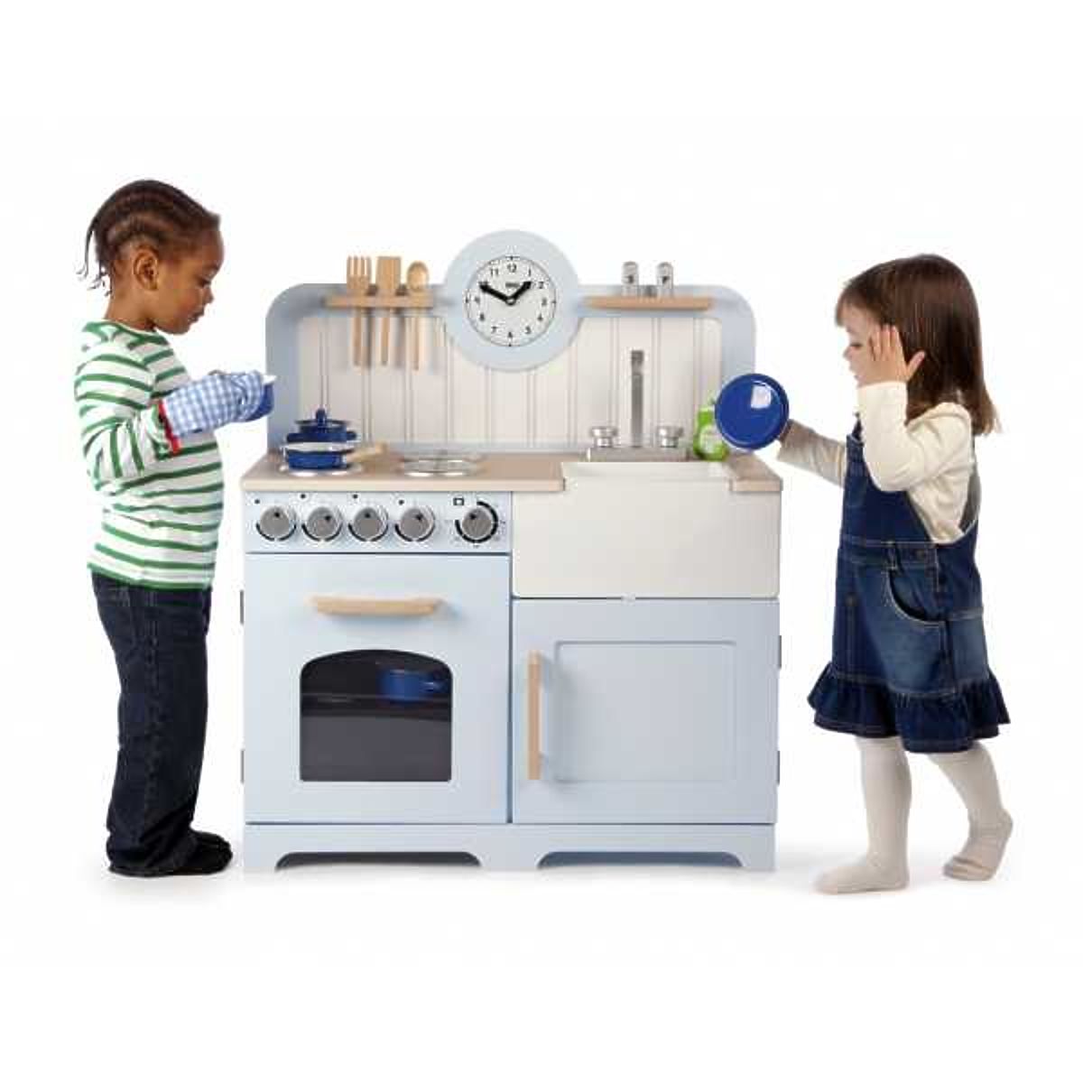 Młodzi przyszli kucharze będą się cieszyć gotowaniem i pieczeniem z tą drewnianą kuchnią! Wyposażona jest w cztery palniki, które są sterowane obrotowymi pokrętłami wydającymi klikalny dźwięk. Zawiera również piekarnik z półką i wizjerem, aby młodzi kucharze mogli kontrolować jedzenie. Dodatkowo posiada szafkę do przechowywania, zlew, naczynia, które można zawiesić (zobacz obrazek), sól i pieprz oraz na koniec zegar z obrotowymi wskazówkami. Kuchnia ma wyższy blat, dzięki czemu rosnącym dzieciom posłuży przez wiele lat. Z boku ma uchwyty ułatwiające przenoszenie. Świetny sposób na naukę bezpieczeństwa w kuchni i zdrowego odżywiania dla dzieci. Wspiera kreatywną i wyobraźniową zabawę. Rozwija koordynację ręka-oko i zręczność. Po rozpakowaniu wymaga złożenia. Wykonana z wysokiej jakości materiałów z odpowiedzialnych źródeł. Zgodna z europejską normą bezpieczeństwa. Główne cechy: obrotowe pokrętła dźwiękowe, wyższa powierzchnia robocza, łatwiejsze przenoszenie dzięki bocznym uchwytom, 3 sztuki przyborów kuchennych (solniczka z pieprzniczką, plastikowa miska w zlewie, środek do mycia naczyń), wspiera kreatywność i wyobraźnię.
