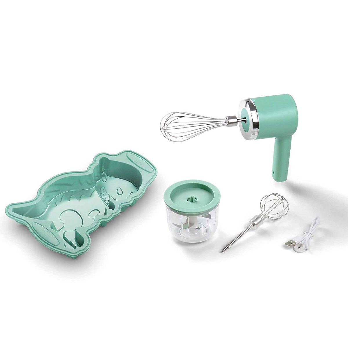 Czy Twoje dzieci lubią spędzać czas w kuchni i chcą być samodzielne? Z tym zestawem 3 w 1 mogą to zrobić. Zestaw narzędzi do pieczenia jest idealny dla małych kucharzy. W skład zestawu wchodzi ręczny mikser, siekacz i silikonowa forma do pieczenia. Każdy element tego zestawu został zaprojektowany z naciskiem na praktyczność i łatwość obsługi. Mikser i siekacz są lekkie, więc dzieci mogą je bez problemu unieść i utrzymać. Ręczny mikser akumulatorowy z 2 końcówkami ma 5 prędkości. Siekacz o pojemności 300 ml. Silikonowa forma w kształcie dinozaura jest nieprzywierająca i elastyczna. Forma wytrzymuje ekstremalne temperatury: do 230°C i -40°C, więc nadaje się do piekarnika oraz np. do zamrażarki. Wymiary formy to 27x17x6 cm, pojemność 950 ml. Bez BPA. Łatwe ładowanie za pomocą kabla USB. Kabel USB jest dołączony do zestawu. To urządzenie mogą używać dzieci, jeśli są pod nadzorem osoby dorosłej lub zostały poinstruowane o bezpiecznym użytkowaniu urządzenia i rozumieją potencjalne zagrożenia. Główne cechy: 3 w 1 w jednym ułatwia przygotowywanie różnych potraw, doskonały pomocnik w kuchni.