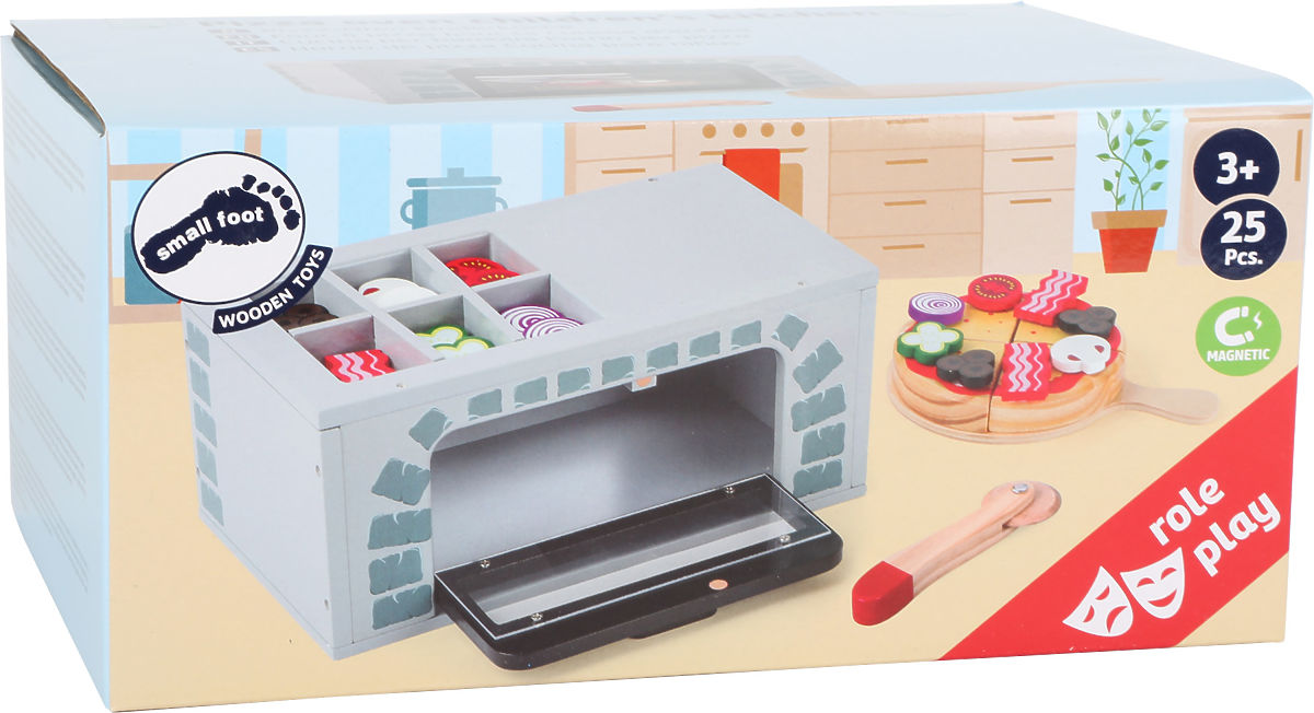 Pieczenie pizzy jak dla dorosłych! Mali piekarze mogą tutaj upiec własną pizzę, a dzięki rzepom ozdobić ją według własnego smaku (cebula, grzyby, pomidory, ogórki, bekon, oliwki). Drewniana łopatka do pizzy wkłada ją do pieca, który można otwierać i zamykać ruchomymi drzwiczkami. Dodatki są przechowywane w przejrzystych przegródkach w górnej części pieca. Po upieczeniu wystarczy podzielić pizzę na cztery równe części za pomocą krajalnicy. Kto następny jest głodny? Główne cechy: otwierane drzwiczki pieca, składniki na pizzę połączone rzepem, trenuje motorykę, wspiera aktywną zabawę w role i rozwój umiejętności społecznych podczas zabawy.