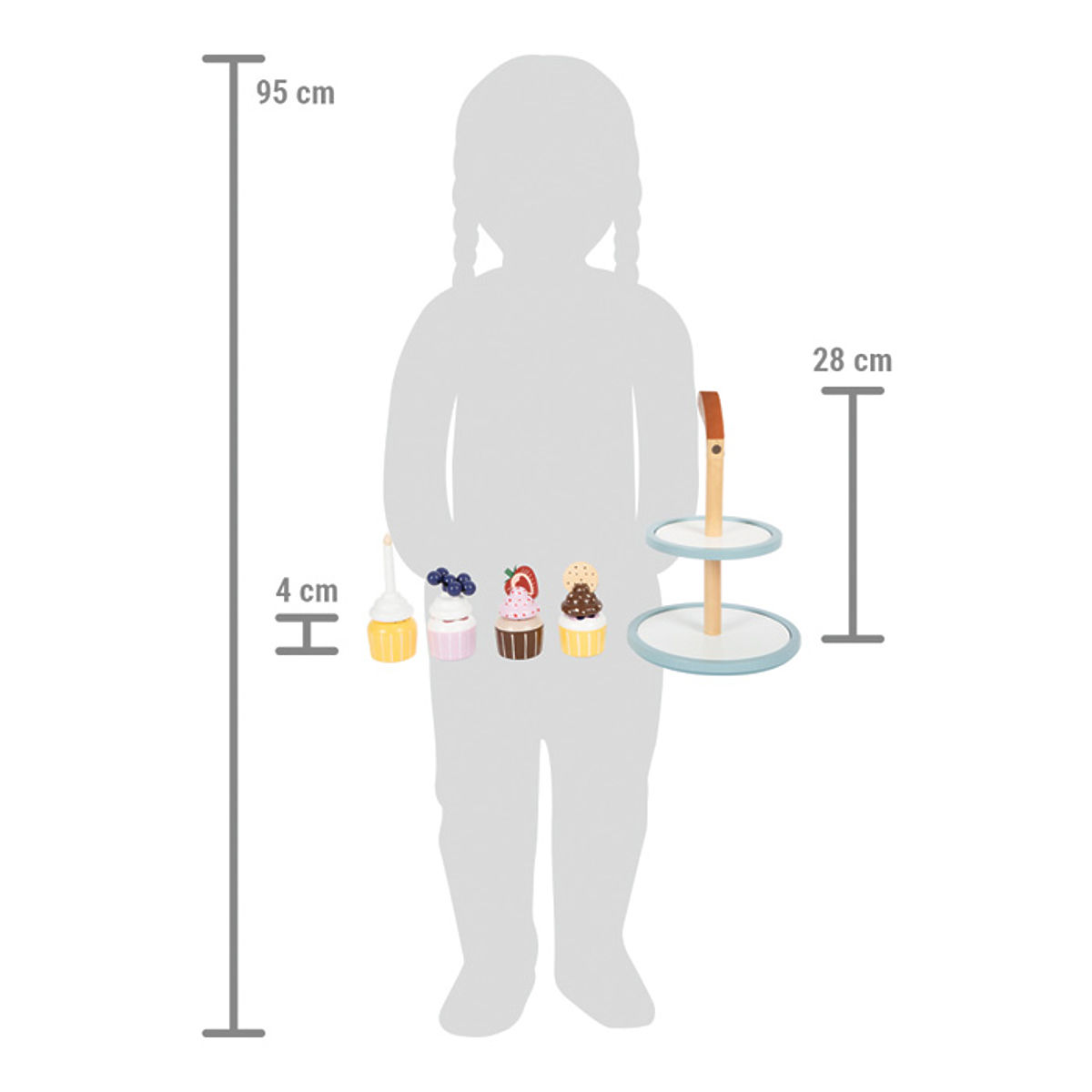 Przysmaki do dziecięcej kuchni. Ten stojak z czterema babeczkami zaprasza małych cukierników do aktywnej zabawy i prezentowania pysznych muffinek. Stojak ma dwa poziomy, które służą do eksponowania słodyczy w warstwach. System łączonych podstaw i kremowych wierzchów umożliwia szerokie możliwości kombinacji. Poszczególne elementy są połączone za pomocą zintegrowanych magnesów. Zestaw uzupełniają podwójne ciastko, truskawkowy kawałek, jagody i świeczka urodzinowa, którą można ozdobić ciasta. To zachęca do herbatki z lalkami, misiami itp. Kto nie poczuje się głodny na ten widok? Idealny dodatek do kuchni i sklepu spożywczego. Detale, takie jak uchwyt z ciemnobrązowej imitacji skóry, zintegrowane magnesy i nowoczesne, subtelne skandynawskie kolory czynią stojak wysokiej jakości i stylową ozdobą do pokoju dziecięcego. Główne cechy: subtelne skandynawskie kolory inspirują i zachęcają do rozmowy 1 stojak, 4 babeczki, 4 polewy, 1 świeczka, 1 ciastko, 1 truskawka, 1 jagoda