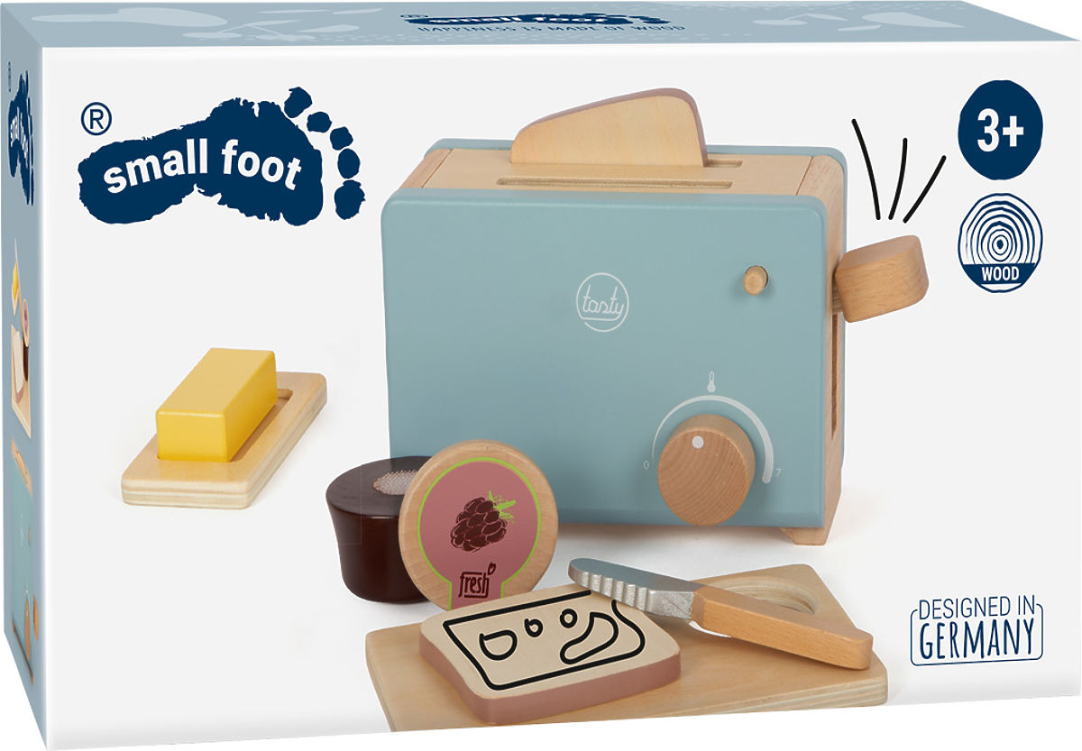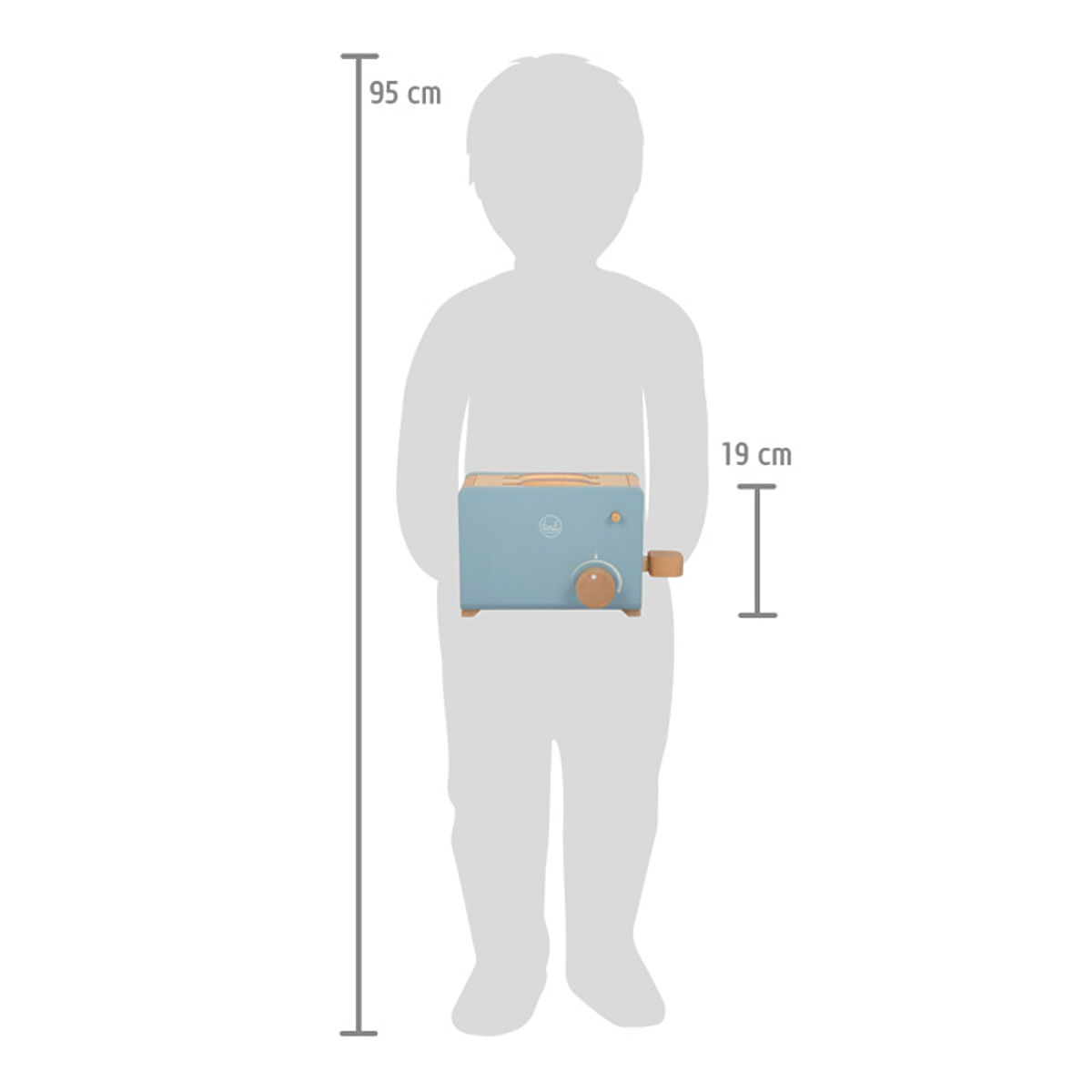 Z tym tosterem i jego akcesoriami każde śniadanie przygotowane w dziecięcej kuchni będzie hitem! Ma funkcję wyskakującą i delikatny design w dymnym niebieskim i białym kolorze, zabawka zawiera również wiele naturalnego drewna. Wśród bogatych akcesoriów znajdziesz kromki chleba tostowego, nóż, masło, marmoladę, co pomoże w realistycznej zabawie! Toster ma obrotowe i ruchome przyciski oraz dźwignię. Kromki tostów można włożyć do tostera za pomocą dużej dźwigni z boku, a także je wysunąć. Obrotowym klikającym przyciskiem dzieci mogą ustawić temperaturę. Deseczkę śniadaniową można zawiesić dzięki otworowi, co zajmuje mniej miejsca podczas przechowywania. Ten zestaw ma kolorowy design kompatybilny z innymi produktami z serii Tasty od Small Foot, na przykład Drewnianą kuchnią LE12216. Główne cechy: drewniany toster z funkcją wyskakującą, bogate akcesoria – kromki tostów, nóż, deseczka, masło, marmolada, obrotowe klikające przyciski, do wycięcia w deseczce idealnie pasuje marmolada, pasuje do innych produktów z serii Tasty, podczas zabawy rozwija codzienne i społeczne umiejętności.