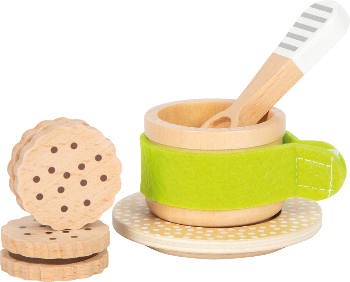 Uwaga wszyscy przyjaciele herbaty i miłośnicy kawy. Ten zestaw został zaprojektowany z myślą o najmłodszych gospodarzach, którzy lubią naśladować dorosłych przy przygotowywaniu kawy i herbaty. Zestaw ma piękny design, interesujące detale, dużą ilość drewnianych materiałów i przyjemne w dotyku filcowe elementy. Dwa kubki z podstawkami, dwie łyżeczki, cukiernica, dzbanek na mleko oraz duży dzbanek na kawę/herbatę są uzupełnione talerzem i kanapkowymi ciastkami. Cukiernica i dzbanek na kawę/herbatę mają zdejmowane pokrywki dla jeszcze bardziej realistycznej zabawy. Wspiera rozwój wyobraźni i umiejętności społecznych. Główne cechy: wspiera kreatywność i umiejętności społeczne, wykonany z drewna i filcowych dodatków, świetny dodatek do dziecięcej kuchni, przyjemne w dotyku filcowe elementy.