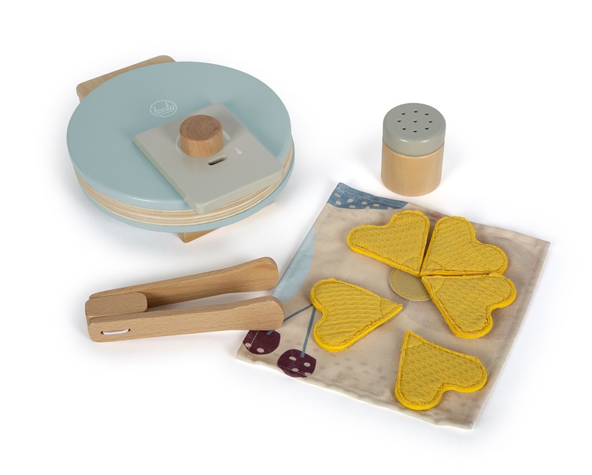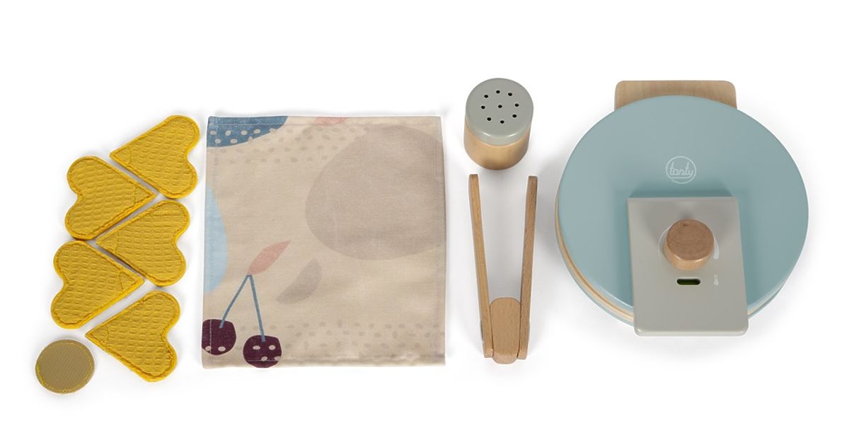 Masz ochotę na gofry? Z zestawem do przygotowywania gofrów z bogatymi akcesoriami to żaden problem. Twój mały kucharz lub kucharka mogą jednocześnie przygotować aż pięć gofrów w kształcie serca. Są wykonane z tkaniny, połączone na środku rzepem i wyglądają jak prawdziwe. Podczas obracania pokrętła na gofrownicy kolor kontrolki zmienia się z czerwonego na zielony, co pozwala kucharzowi dowiedzieć się, czy gofry są już odpowiednio upieczone. W skład zestawu wchodzi materiałowa serwetka, szczypce i cukierniczka do posypywania gofrów, która podczas posypywania wydaje szeleszczący dźwięk. Główne cechy: odpowiednie do dziecięcej kuchni, wspiera kreatywną i pomysłową zabawę pełną fantazji, trenuje umiejętności społeczne, nowoczesne kolory w stylu skandynawskim.