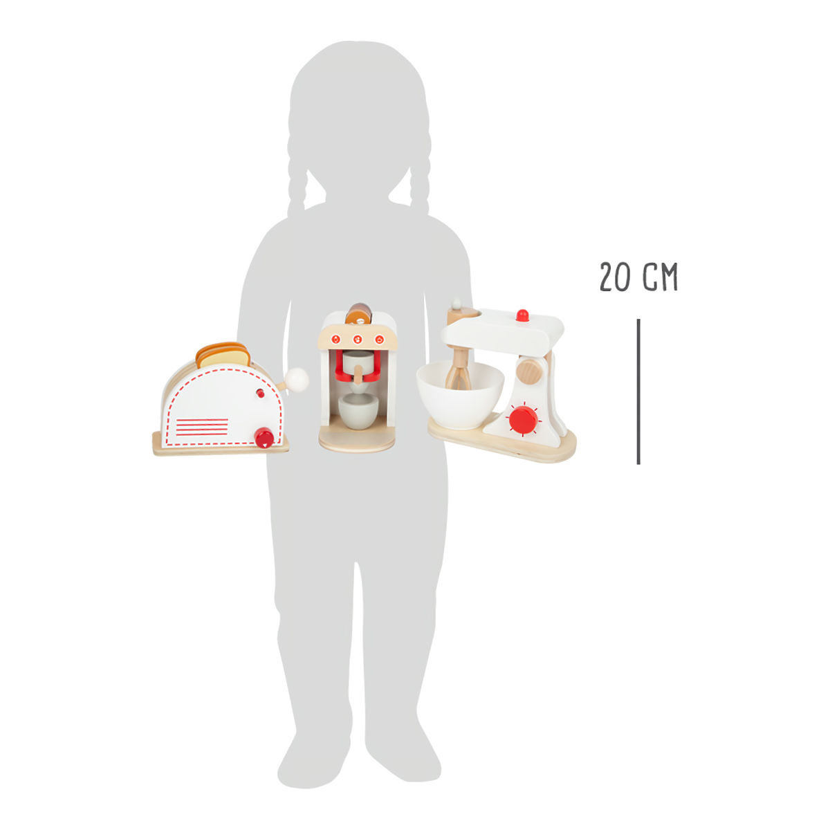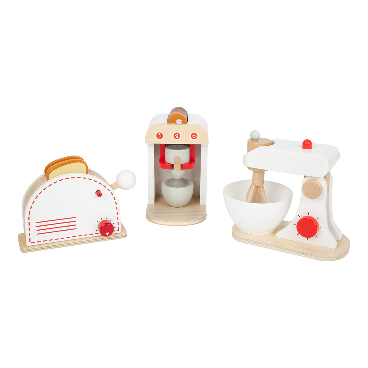 Kompletny zestaw popularnych urządzeń kuchennych! Ten zestaw oferuje toster, ekspres do kawy i blender, więc wszystko, czego potrzebuje każda właściwa kuchnia. Drewniane urządzenia wspierają dzieci w zabawie w role, są również bardzo realistyczne. Mają klikające pokrętła, toster ma również dźwignię, którą można „wystrzelić” opieczone tosty, a trzepaczka blendera się obraca. Ekspres do kawy ma różne rodzaje ziaren kawy, dzięki czemu można przygotować espresso, cappuccino lub latte. Główne cechy: blender z misą, toster z 2 tostami, ekspres do kawy z dźwignią i 4 kapsułkami, filiżanka funkcjonalne, wyjmowane i ruchome części klikające pokrętła solidne i trwałe drewniane wykonanie