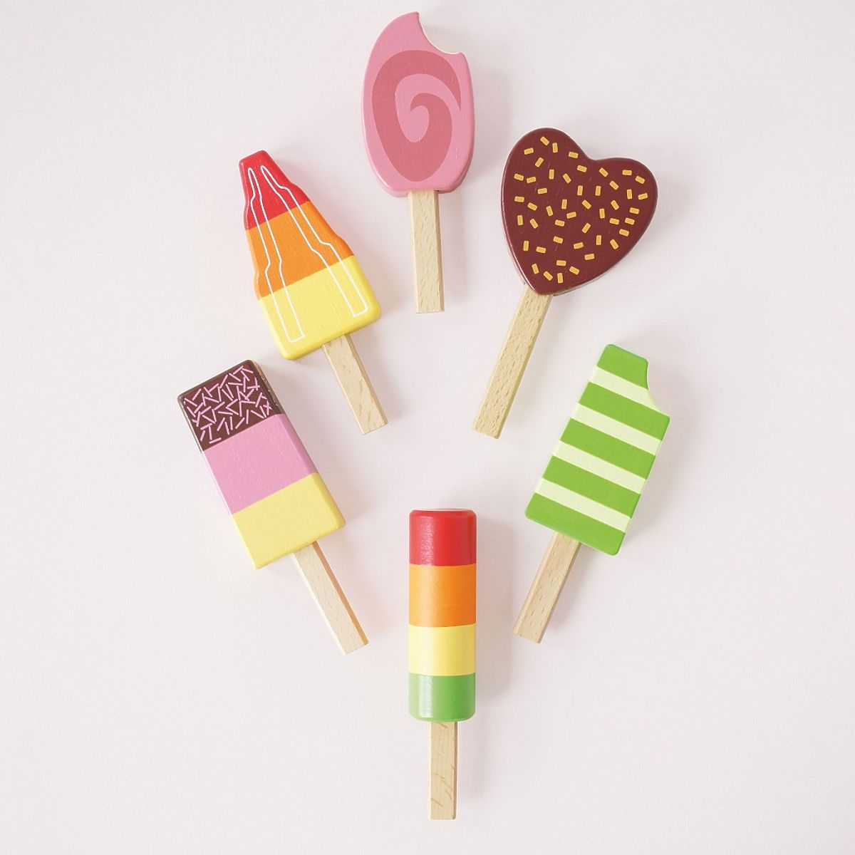 Zestaw sześciu ręcznie malowanych lodów na patyku jest idealny do kreatywnej zabawy. Trwała zabawka z solidnego drewna kauczukowego, wyposażona w drewniany .. więcej