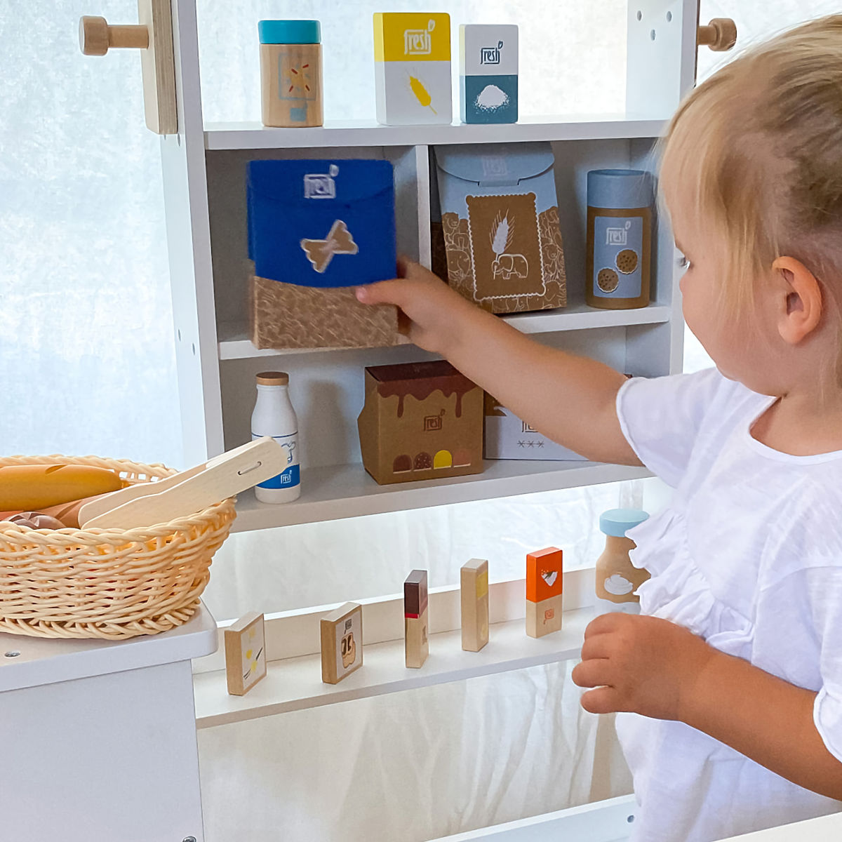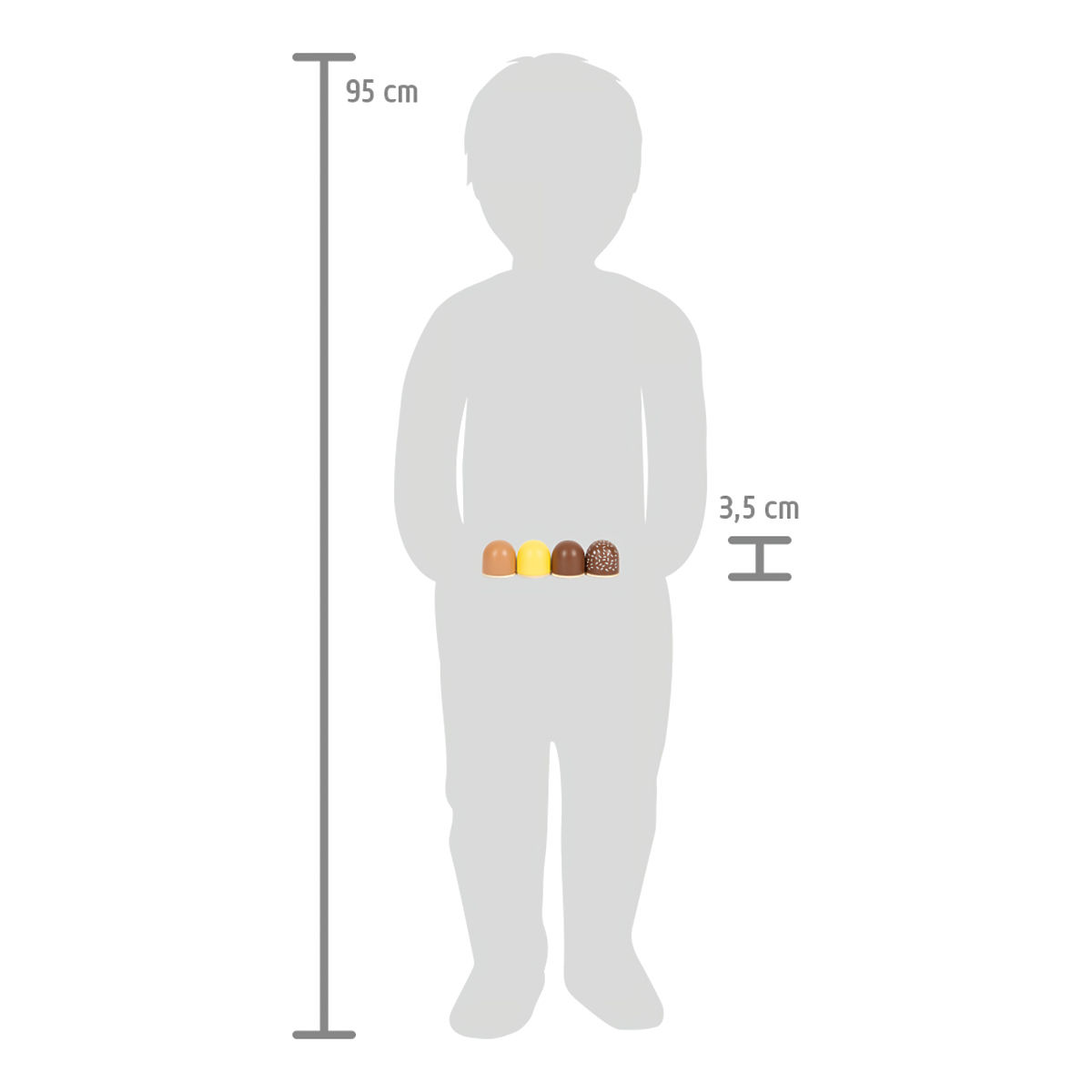 Dla małych łasuchów! Te cztery słodkie pralinki z marshmallow w środku są wykonane z drewna i będą doskonale pasować do dziecięcych stoisk handlowych i kuchni. W opakowaniu znajdują się cztery warianty: biała czekolada, ciemna czekolada, ciemna czekolada z posypką i mleczna czekolada. Ich naturalny wygląd zachwyci dzieci tak samo, jak ich ekologiczne kartonowe opakowanie. Pralinki z marshmallow wyglądają jak prawdziwe i posłużą dzieciom do zabawy w sklep, piknik, fabrykę czekolady... W połączeniu z innymi produktami z serii „Fresh” zapewnią prawdziwą zabawę. Główne cechy: cztery czekoladowe pralinki z drewna, biała czekolada, gorzka czekolada, gorzka czekolada z posypką, mleczna czekolada, realistyczny design do kreatywnej zabawy, nieprzetworzony karton, z którego można łatwo wyjąć pralinki, kompatybilne z innymi produktami z serii „Fresh”.