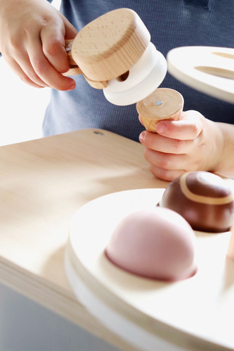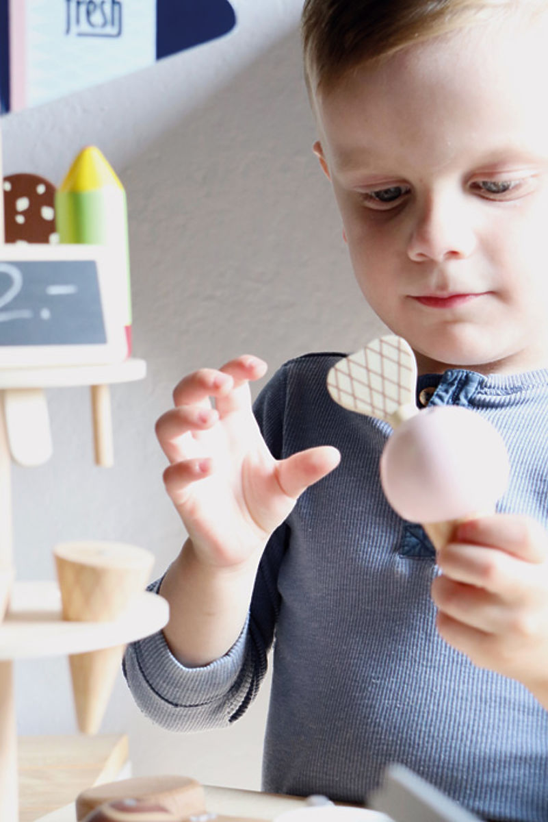 Łyżka do lodów z funkcją magnetyczną. 8 różnych rodzajów lodów, od lodów na patyku po pyszne gałki lodów. Gałki lodów są piętrowane i wyposażone w magnesy. Waflowe serduszka i porcja bitej śmietany do dekoracji lodowych kreacji. Wszystkie części lodów mieszczą się w kolorystycznie oznaczonych miejscach na stojaku. Neutralna płciowo, stonowana kolorystyka z dużą ilością widocznego drewnianego materiału. Dostarczane z tablicą kredową do zapisywania. Doskonały dodatek do wielofunkcyjnego sklepu i innych produktów spożywczych do zabawy z linii Fresh. Główne cechy: Części wyposażone w magnesyKażda rzecz ma swoje miejsce na stojakuRozwija umiejętności komunikacyjne i społeczne dziecka
