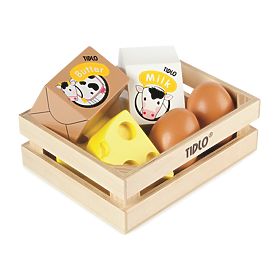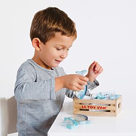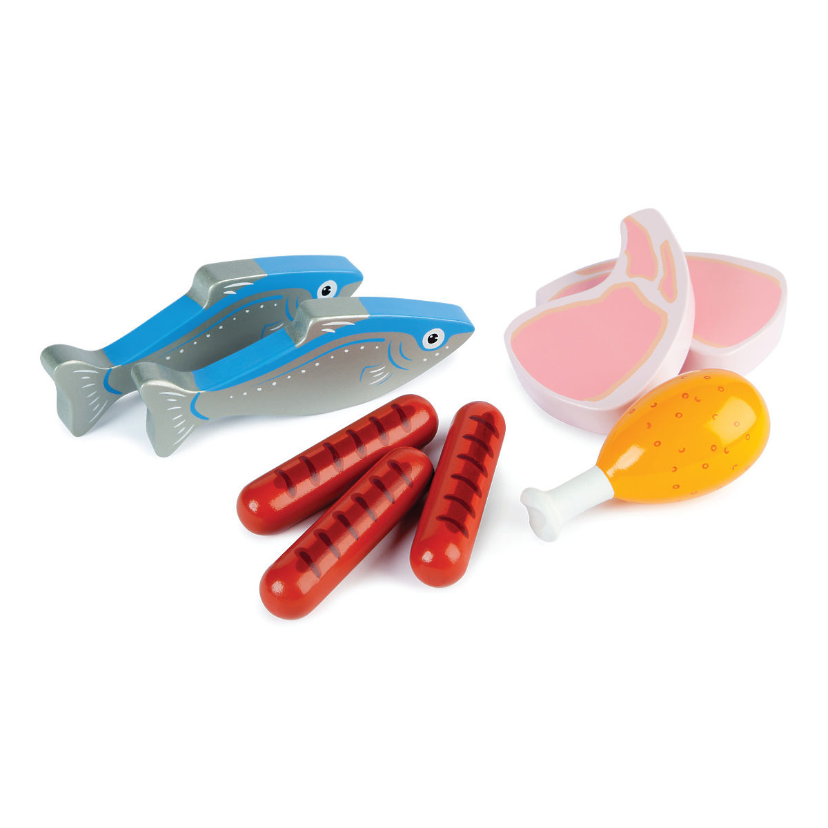 Świeża dostawa mięsa i ryb w drewnianym pudełku z uchwytami. Świetna zabawka do zabawy w handlarza lub kucharza, w zestawie znajdują się 2 ryby, 2 kotlety, 3 kiełbaski i 1 udko kurczaka. Świetny sposób na nauczenie dzieci, jak ważna jest zdrowa i zbilansowana dieta, a także o tym, skąd pochodzi żywność i jak ją przygotować. Każdy z elementów jest pulchny i idealny dla rączek małych dzieci. Zachęca do kreatywnej i pomysłowej zabawy. Wykonane z wysokiej jakości materiałów pochodzących z odpowiedzialnych źródeł. Odpowiada europejskiemu standardowi bezpieczeństwa. Główne cechy: idealny kształt dla rączek małych dzieci wspiera kreatywność i wyobraźnię