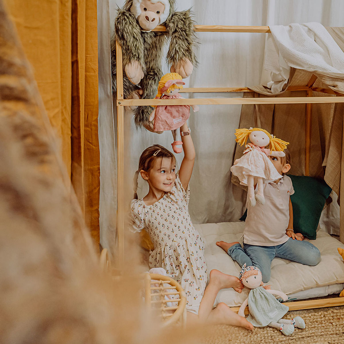 Lalka materiałowa Suzette często jest zamyślona i lubi zanurzać się w pięknych opowieściach. Chętnie nosi ładne, zwiewne różowe sukienki z bawełny ozdobione haftami kwiatów, różowe baleriny, opaskę z dużą kokardą z odrobiną tiulu. Ubrania można zdejmować i zakładać ponownie. Lalka jest dostarczana w oryginalnym pudełku prezentowym. Zabawka spełnia europejskie normy bezpieczeństwa CE. Pielęgnacja: Prać w kąpieli w 30°. Zalecenie: Suszenie naturalne lub w niskiej temperaturze. Główne cechy: odpowiednia od urodzenia, bawełniana twarz, haftowane oczy i usta oraz piegi, lalka z akcesoriami, które można zdejmować i zakładać, w pudełku prezentowym.