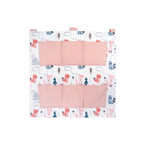 Kieszonka ozdobiona jest pięknym motywem lisów i ich zwierzęcych przyjaciół, a kieszenie mają przyjemny różowy kolor. Dzięki uniwersalnym pastelowym kolorom idealnie wpasuje się w każde pomieszczenie.