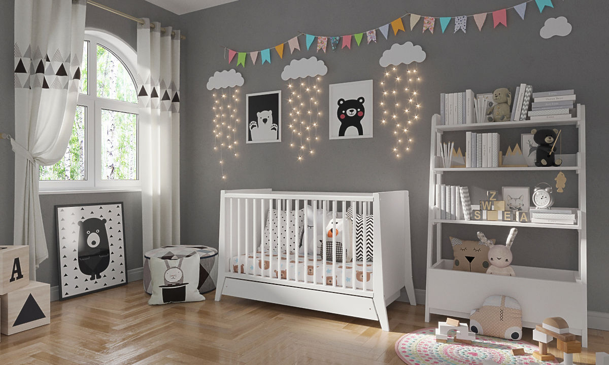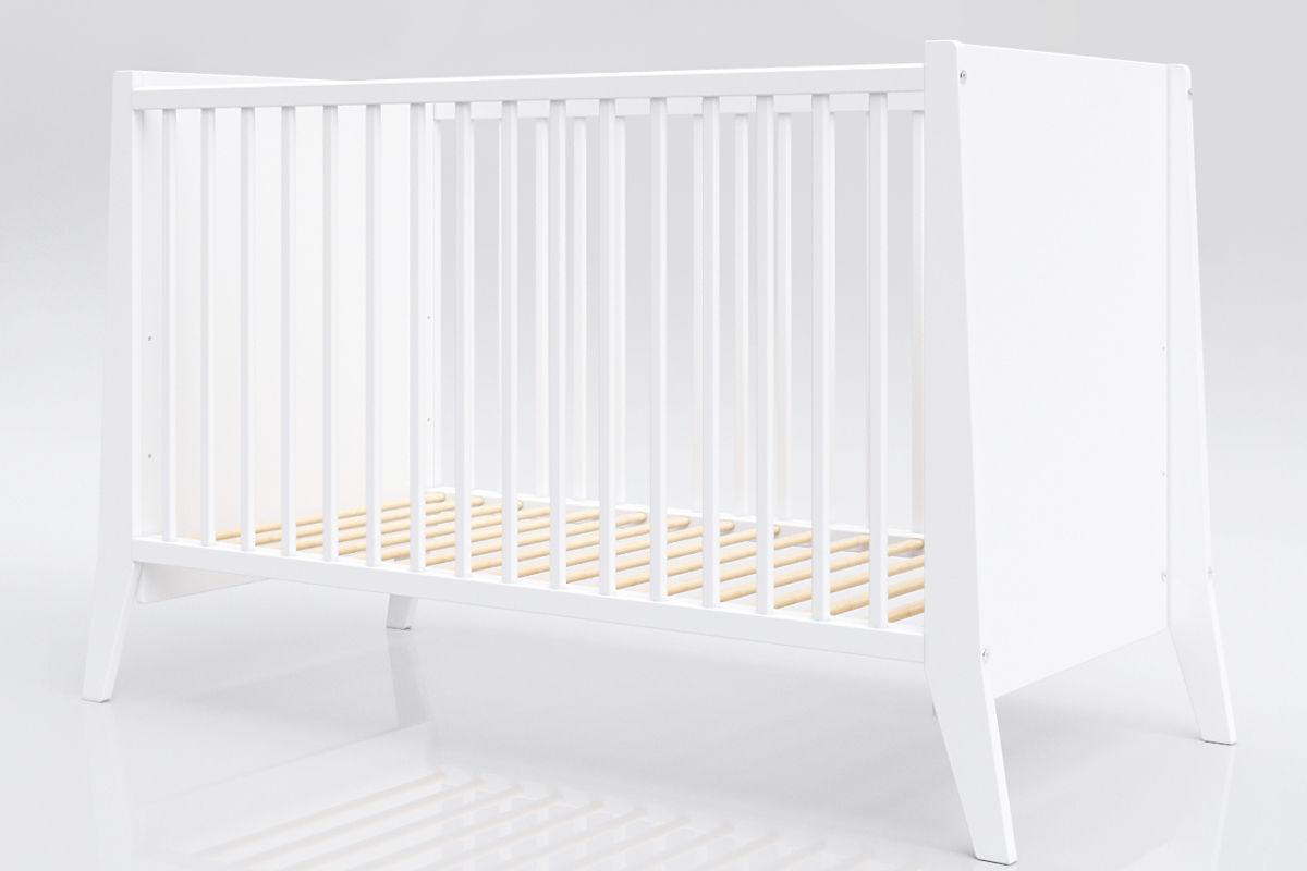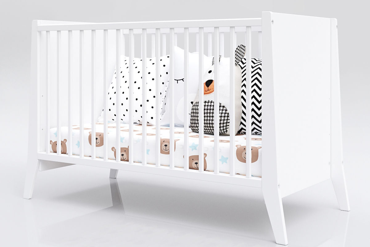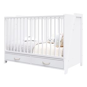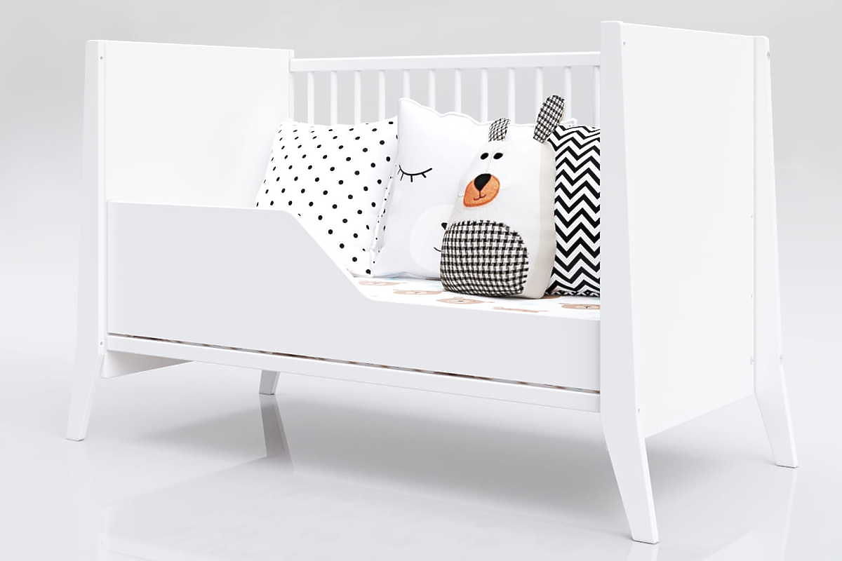 Oryginalny model białego łóżeczka dziecięcego Cosmo w nowoczesnym designie. Standardowy rozmiar 120x60 cm w wersjach z miejscem do przechowywania lub bez. Odpowiednie dla dzieci od urodzenia do wzrostu 100 cm.
