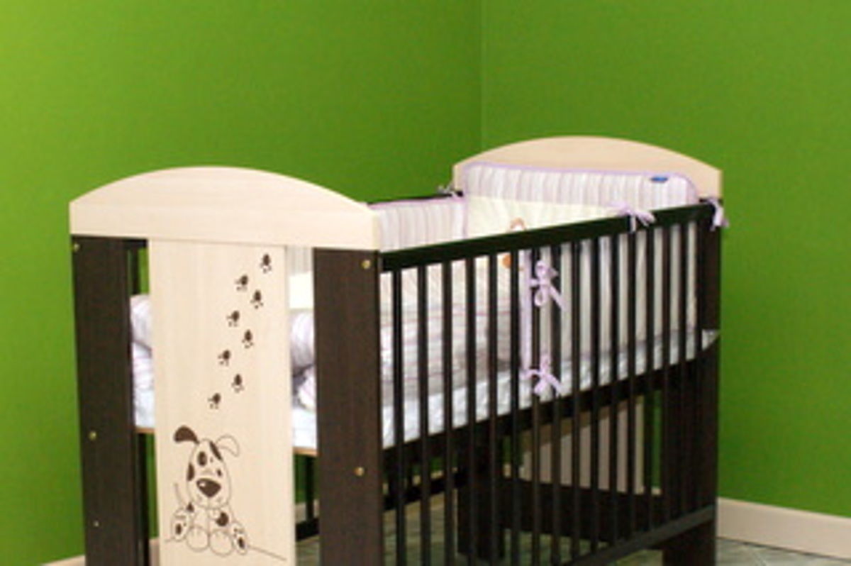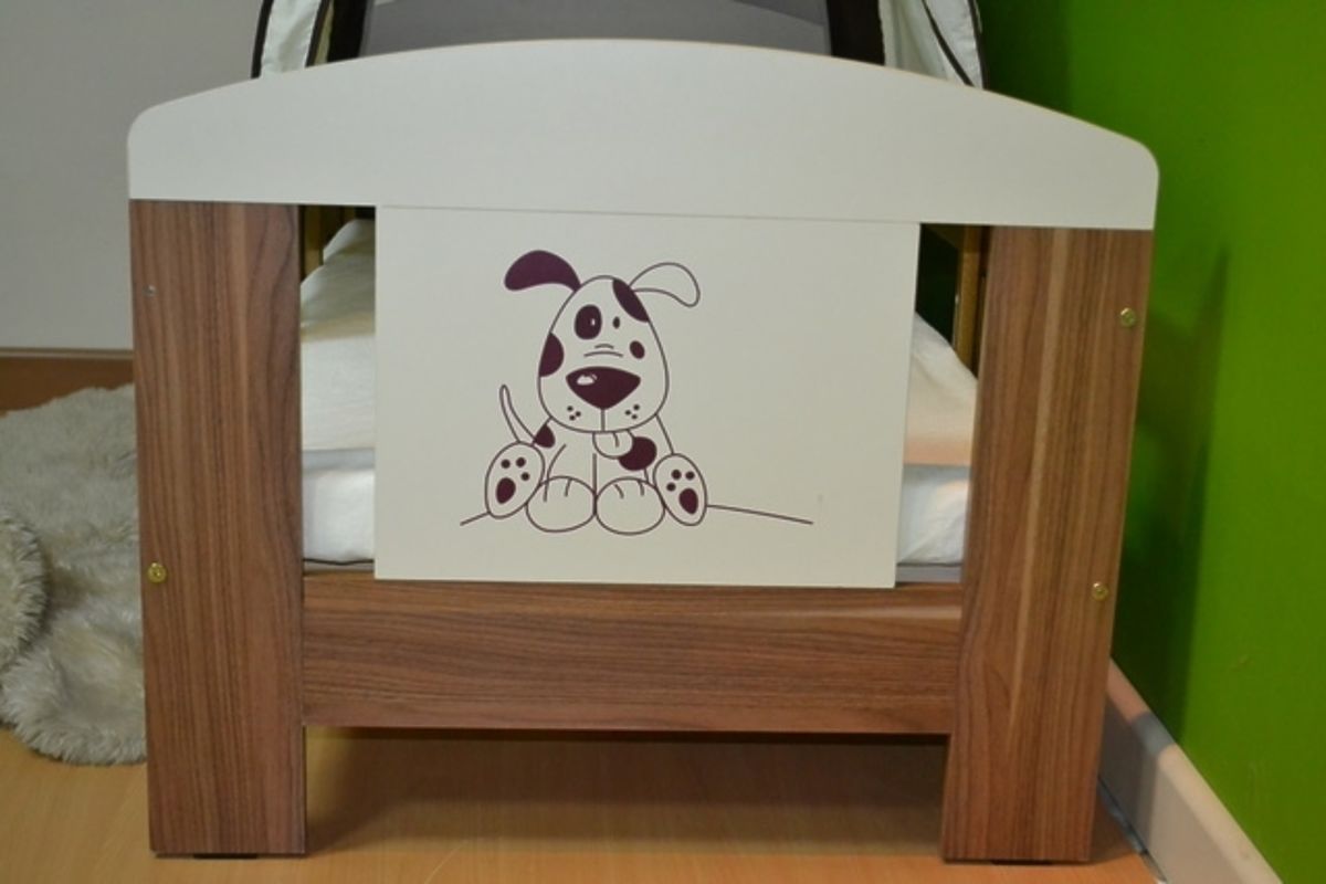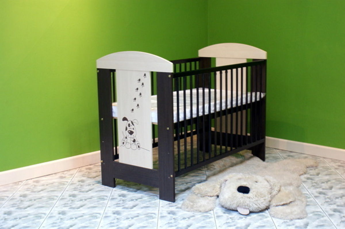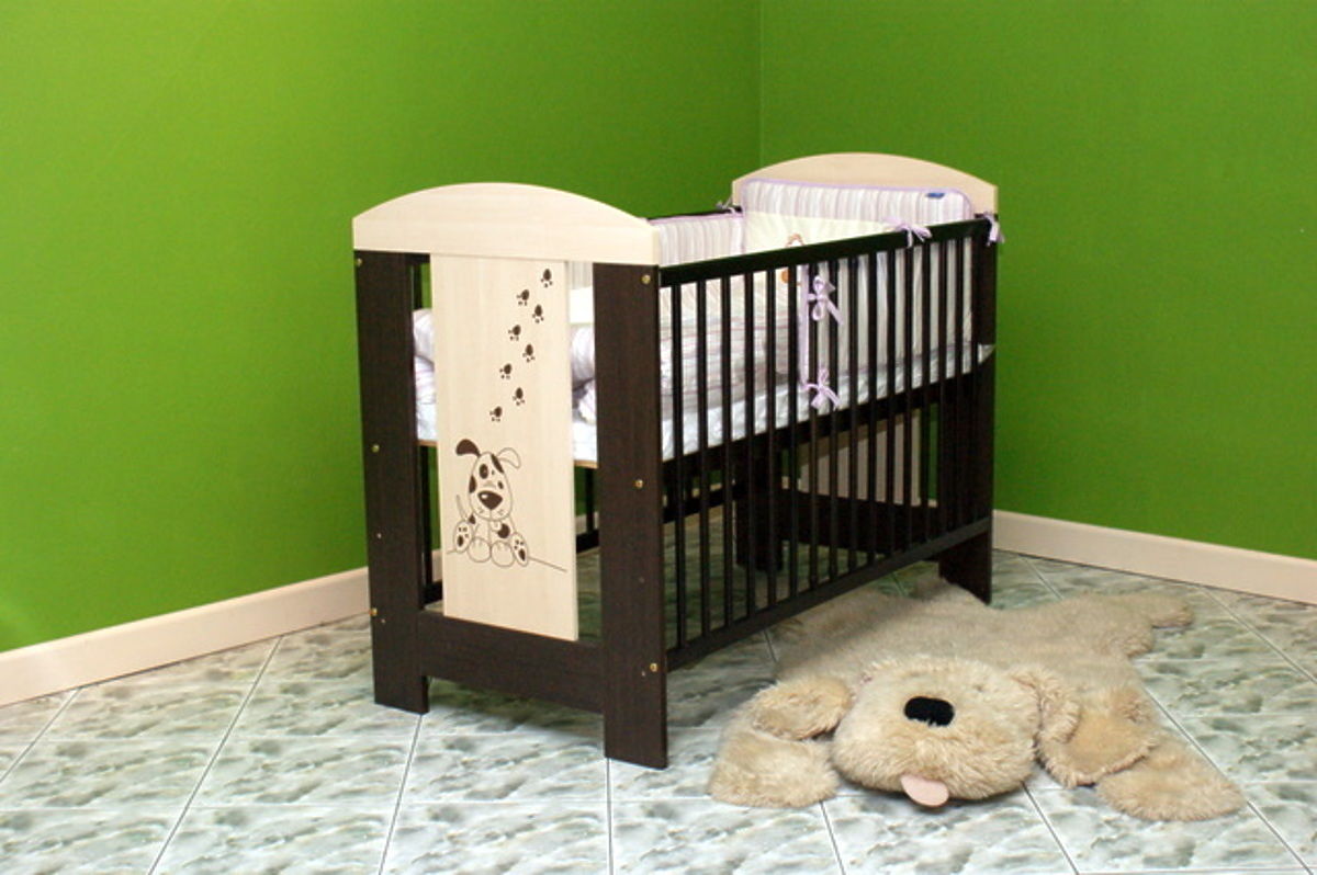 Odcień wanilii i wenge jest bardzo przyjemny, podobnie jak wesoły motyw pieska na czole łóżeczka. Mebel wykonany jest z połączenia płyt MDF i drewna sosnowego. Wymiary zewnętrzne łóżeczka wynoszą 1240 x 650 x 960 milimetrów.
