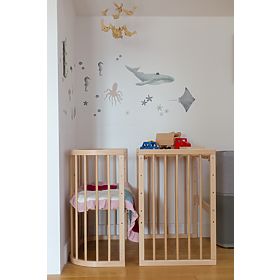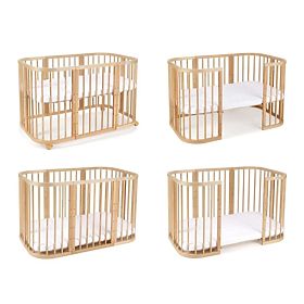 To rosnące łóżko oferuje 7 różnych wariantów przekształceń, które idealnie odpowiadają potrzebom dziecka w różnym wieku. Jednym z nich jest bardzo przydatna wersja łóżeczka portowego z boku łóżka podwójnego , którą docenisz szczególnie w pierwszych tygodniach życia dziecka.