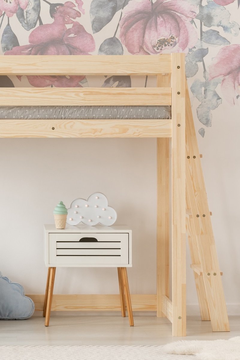 Podwyższone drewniane łóżko Tower z bocznym wejściem jest odpowiednie dla dzieci od sześciu lat. Zaletą tego łóżka jest możliwość wykorzystania przestrzeni pod podwyższonym łóżkiem. Ta przestrzeń doskonale sprawdzi się jako miejsce do przechowywania, kącik do zabawy lub nauki.