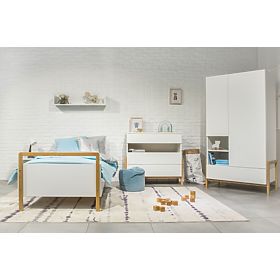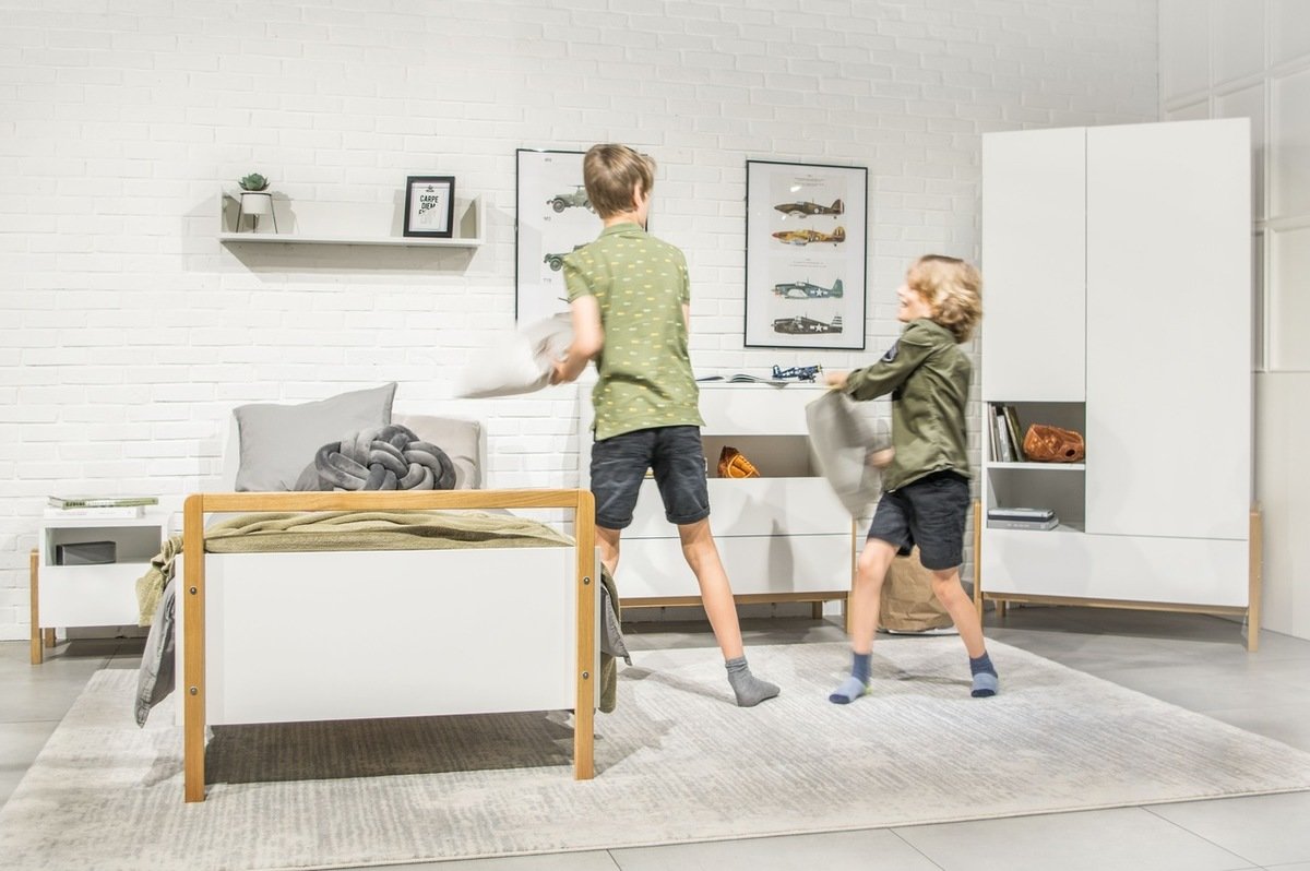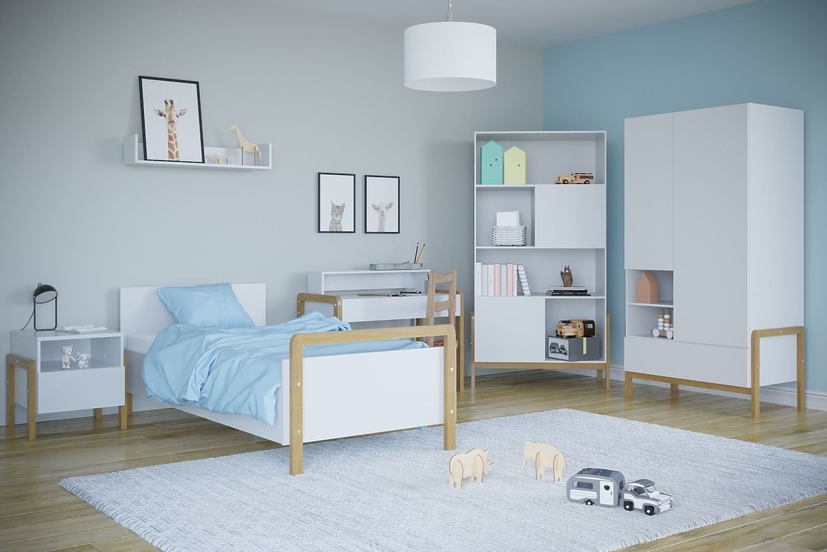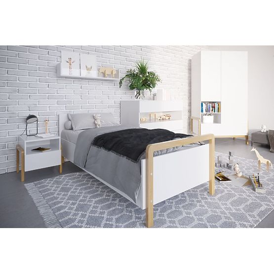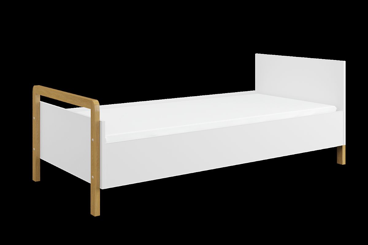 Dziecięce łóżko Viktor w stylu skandynawskim doda uroku każdemu pokoikowi. Białe łóżko z drewnianymi elementami o wymiarach 180 x 80 cm oferuje połączenie wygodnego i bezpiecznego snu.